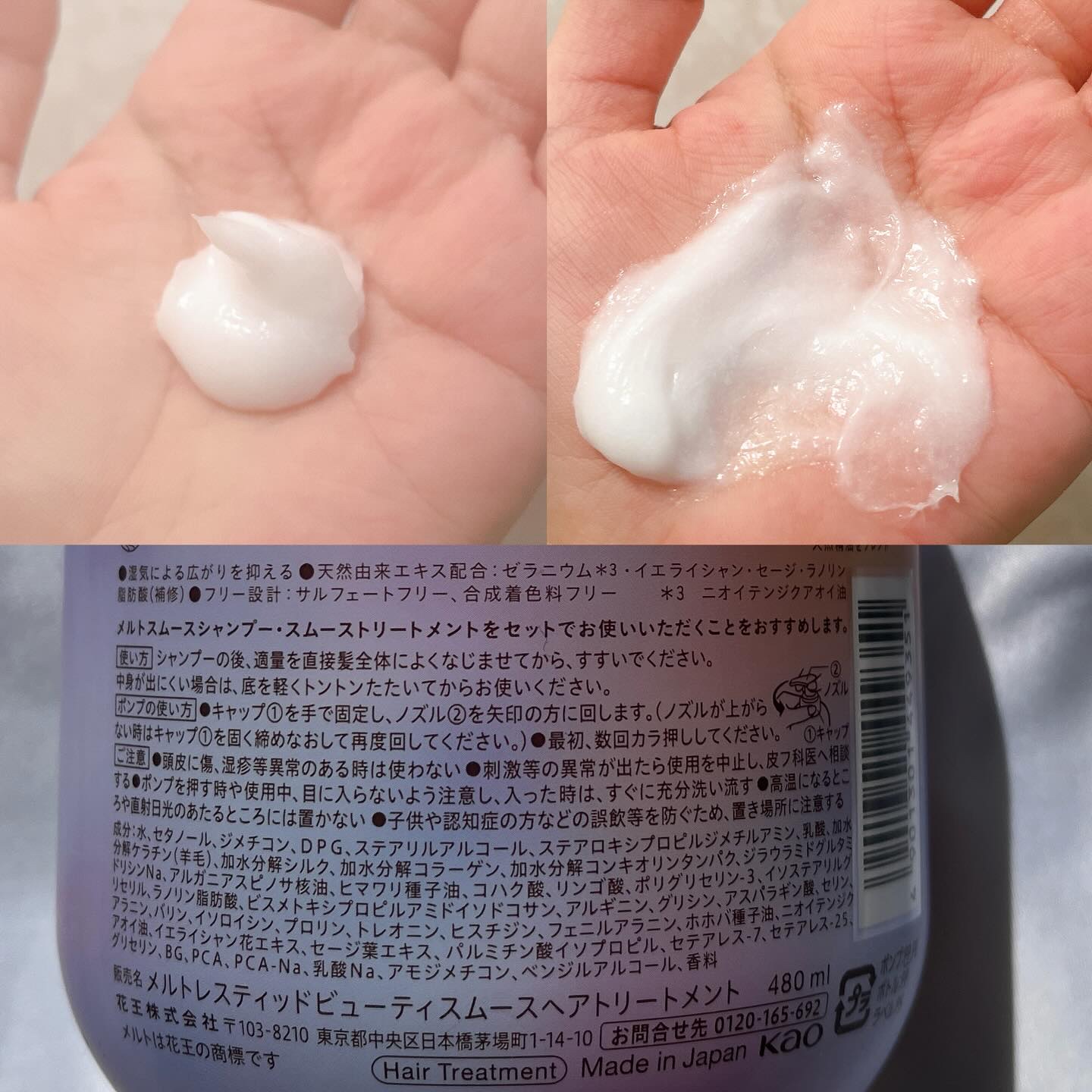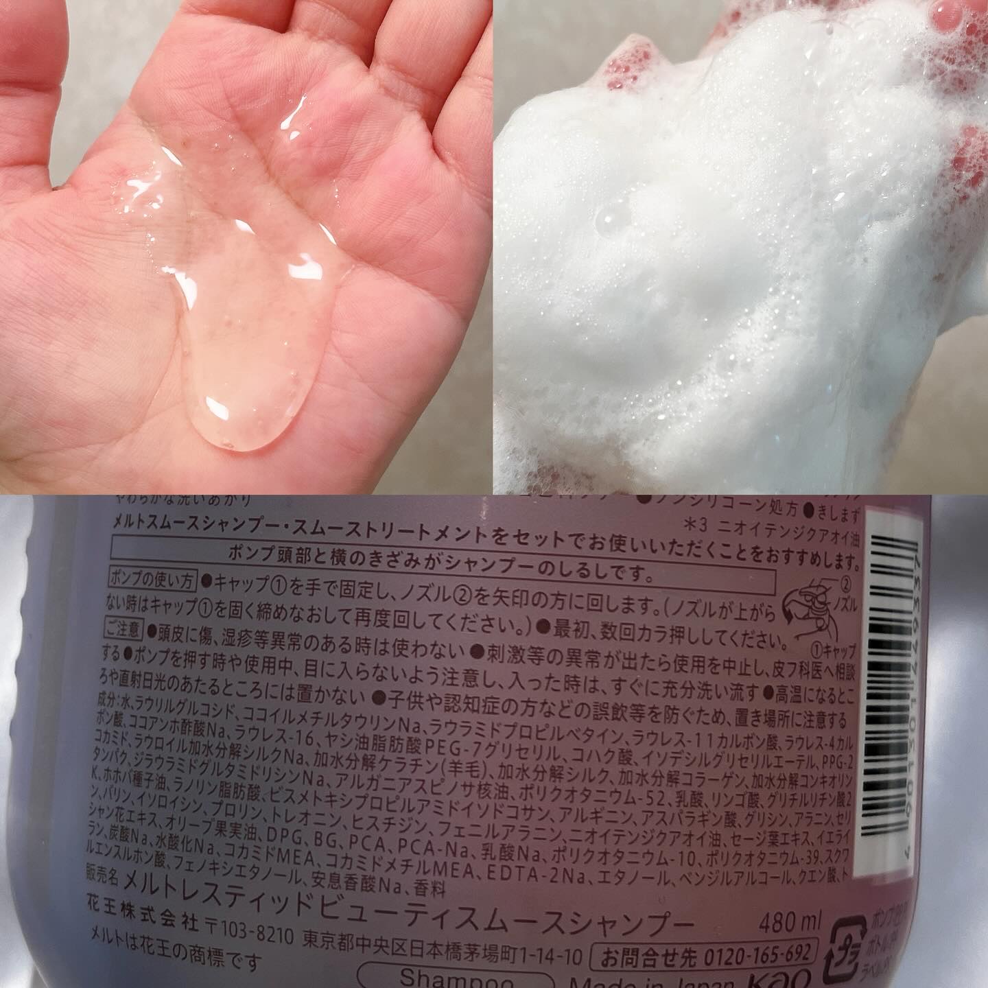 - <シャンプーポンプ(480ml)> 水、ラウリルグルコシド、ココイルメチルタウリンNa、ラウラミドプロピルベタイン、ラウレス-11カルボン酸、ラウレス-4カルボン酸、ココアンホ酢酸Na、ラウレス-16、ヤシ油脂肪酸PEG-7グリセリル、コハク酸、イソデシルグリセリルエーテル、PPG-2コカミド、ラウロイル加水分解シルクNa、加水分解ケラチン(羊毛)、加水分解シルク、加水分解コラーゲン、加水分解コンキオリンタンパク、ジラウラミドグルタミドリシンNa、アルガニアスピノサ核油、ポリクオタニウム-52、乳酸、リンゴ酸、グリチルリチン酸2K、ホホバ種子油、ラノリン脂肪酸、ビスメトキシプロピルアミドイソドコサン、アルギニン、アスパラギン酸、グリシン、アラニン、セリン、バリン、イソロイシン、プロリン、トレオニン、ヒスチジン、フェニルアラニン、ニオイテンジクアオイ油、セージ葉エキス、イエライシャン花エキス、オリーブ果実油、DPG、BG、PCA、PCA-Na、乳酸Na、ポリクオタニウム-10、ポリクオタニウム-39、スクワラン、炭酸Na、水酸化Na、コカミドMEA、コカミドメチルMEA、EDTA-2Na、エタノール、ベンジルアルコール、クエン酸、トルエンスルホン酸、フェノキシエタノール、安息香酸Na、香料 <トリートメントポンプ(480ml)> 水、セタノール、ジメチコン、DPG、ステアリルアルコール、ステアロキシプロピルジメチルアミン、乳酸、加水分解ケラチン(羊毛)、加水分解シルク、加水分解コラーゲン、加水分解コンキオリンタンパク、ジラウラミドグルタミドリシンNa、アルガニアスピノサ核油、ヒマワリ種子油、コハク酸、リンゴ酸、ポリグリセリン-3、イソステアリルグリセリル、ラノリン脂肪酸、ビスメトキシプロピルアミドイソドコサン、アルギニン、グリシン、アスパラギン酸、セリン、アラニン、バリン、イソロイシン、プロリン、トレオニン、ヒスチジン、フェニルアラニン、ホホバ種子油、ニオイテンジクアオイ油、イエライシャン花エキス、セージ葉エキス、パルミチン酸イソプロピル、セテアレス-7、セテアレス-25、グリセリン、BG、PCA、PCA-Na、乳酸Na、アモジメチコン、ベンジルアルコール、香料 <シャンプーつめかえ用(380ml)> 水、ラウリルグルコシド、ココイルメチルタウリンNa、ラウラミドプロピルベタイン、ラウレス-11カルボン酸、ラウレス-4カルボン酸、ココアンホ酢酸Na、ラウレス-16、ヤシ油脂肪酸PEG-7グリセリル、コハク酸、イソデシルグリセリルエーテル、PPG-2コカミド、ラウロイル加水分解シルクNa、加水分解ケラチン(羊毛)、加水分解シルク、加水分解コラーゲン、加水分解コンキオリンタンパク、ジラウラミドグルタミドリシンNa、アルガニアスピノサ核油、ポリクオタニウム-52、乳酸、リンゴ酸、グリチルリチン酸2K、ホホバ種子油、ラノリン脂肪酸、ビスメトキシプロピルアミドイソドコサン、アルギニン、アスパラギン酸、グリシン、アラニン、セリン、バリン、イソロイシン、プロリン、トレオニン、ヒスチジン、フェニルアラニン、ニオイテンジクアオイ油、セージ葉エキス、イエライシャン花エキス、オリーブ果実油、DPG、BG、PCA、PCA-Na、乳酸Na、ポリクオタニウム-10、ポリクオタニウム-39、スクワラン、炭酸Na、水酸化Na、コカミドMEA、コカミドメチルMEA、EDTA-2Na、エタノール、ベンジルアルコール、クエン酸、トルエンスルホン酸、フェノキシエタノール、安息香酸Na、香料 <トリートメントつめかえ用(380ml)> 水、セタノール、ジメチコン、DPG、ステアリルアルコール、ステアロキシプロピルジメチルアミン、乳酸、加水分解ケラチン(羊毛)、加水分解シルク、加水分解コラーゲン、加水分解コンキオリンタンパク、ジラウラミドグルタミドリシンNa、アルガニアスピノサ核油、ヒマワリ種子油、コハク酸、リンゴ酸、ポリグリセリン-3、イソステアリルグリセリル、ラノリン脂肪酸、ビスメトキシプロピルアミドイソドコサン、アルギニン、グリシン、アスパラギン酸、セリン、アラニン、バリン、イソロイシン、プロリン、トレオニン、ヒスチジン、フェニルアラニン、ホホバ種子油、ニオイテンジクアオイ油、イエライシャン花エキス、セージ葉エキス、パルミチン酸イソプロピル、セテアレス-7、セテアレス-25、グリセリン、BG、PCA、PCA-Na、乳酸Na、アモジメチコン、ベンジルアルコール、香料