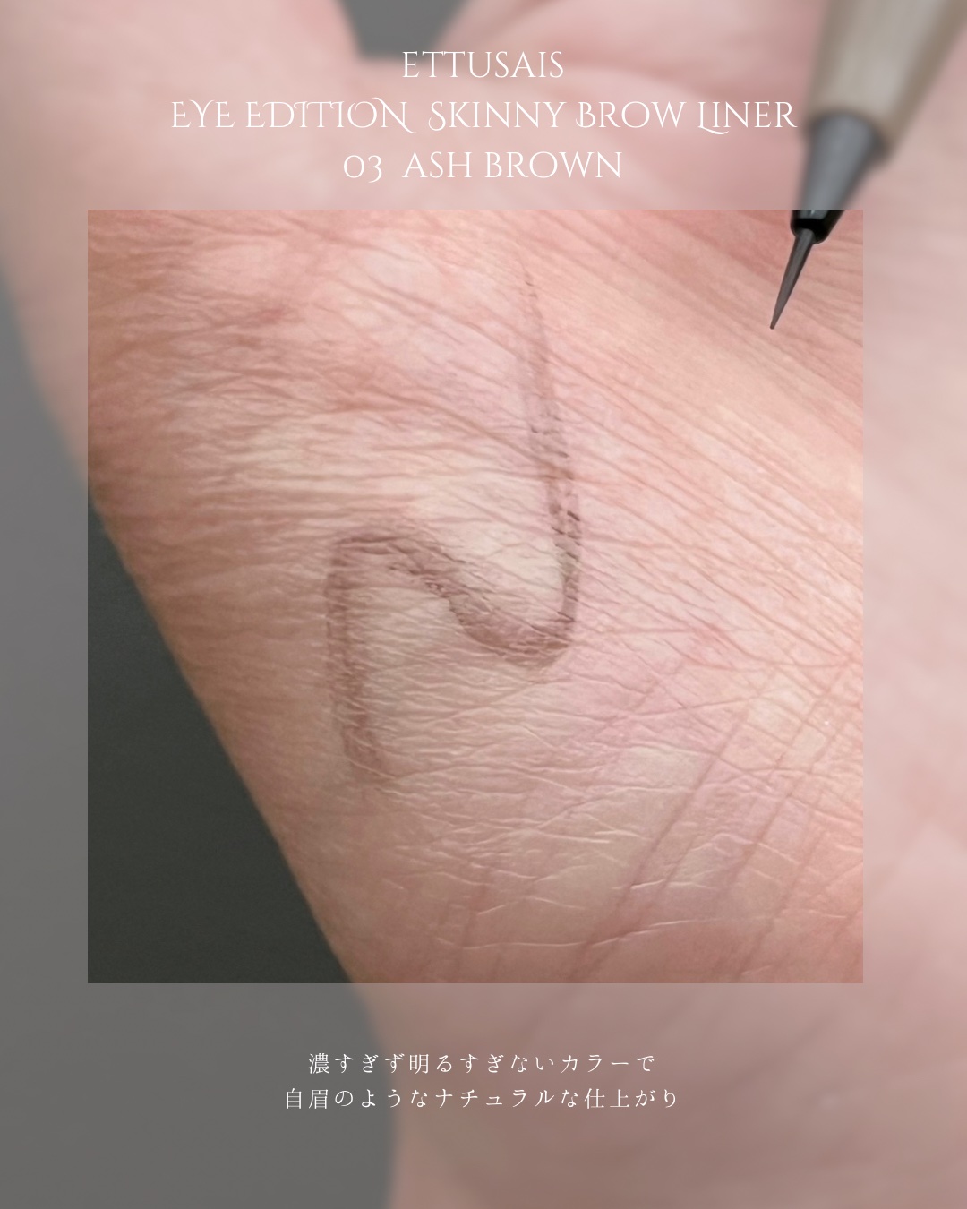 びっくりするほどの細いアイブロウライナーでナチュラルな眉メイクが叶います♪ 絶妙な発色で薄すぎず濃すぎずでどの色味もナチュラルに自眉に溶け込むような発色です。 色持ちも良いので眉尻が消えがちという方にも試していただきたいです!