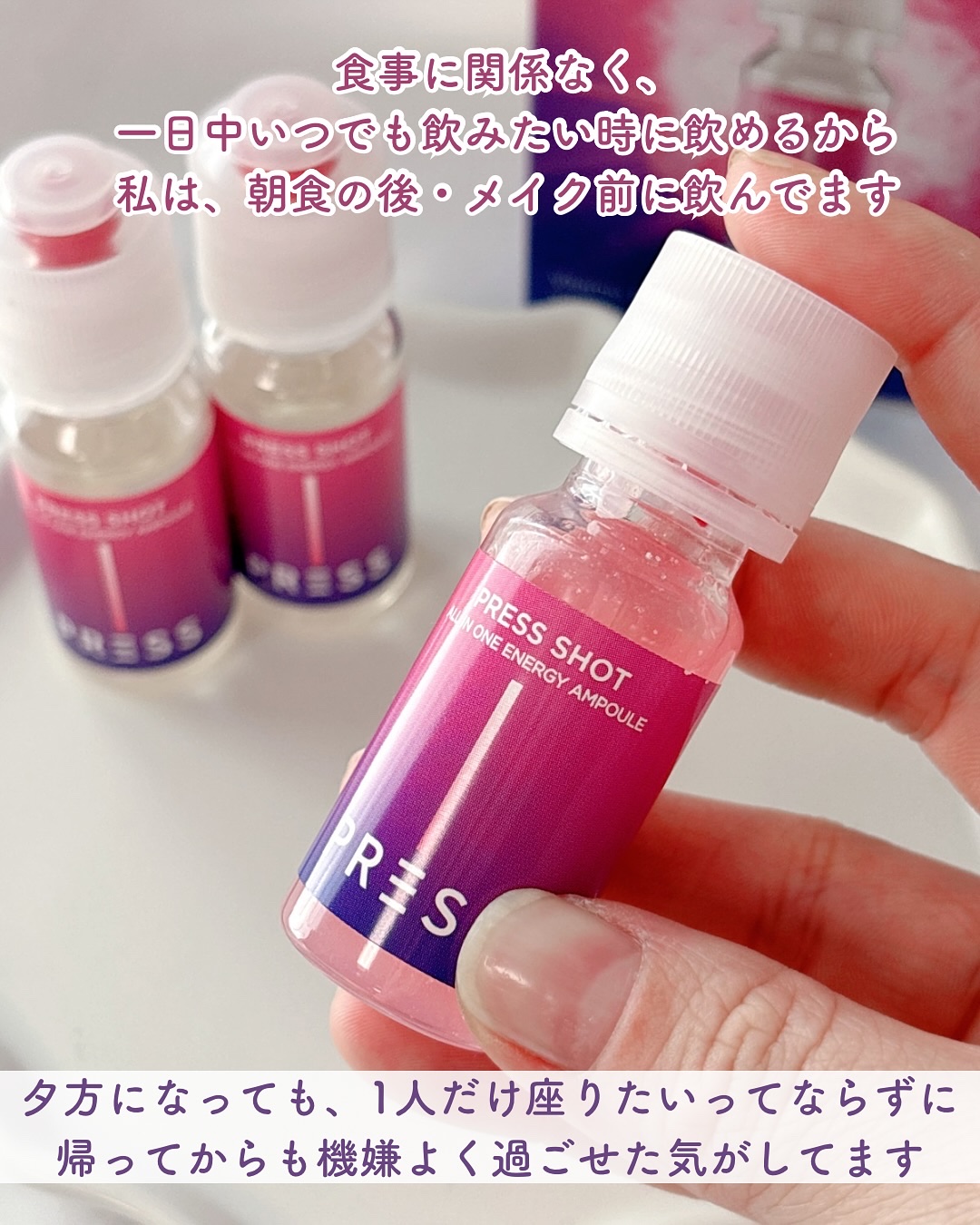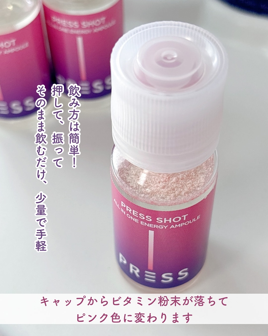 - ・PRESSしてSHAKEするだけ!魔法のようなピンクビタミンに! ・飲むインナービューティー ・飲むピンクビタミン ・粉末にはビタミン B12/D/E、葉酸、ナイアシン、亜鉛が含まれています ・吸収力を重視した液状タイプでの商品設計 ・特許取得の特殊キャップにビタミンを真空密封 ・ビタミンB群を集中配合 ・ビタミンB12は1日の基準値に対し16,667%配合 ・液体は11種類のアミノ酸で吸収しやすい設計 ・飲む瞬間にキャップを押す⇒ビタミンが液体に混ざりフレッシュなビタミンドリンクが完成! 【注意事項】 ・高カルシウム血症がある場合、または医薬品を服用されている方は専門家に相談してください。 ・体に異変を感じた場合は使用を中止し、速やかに専門家に相談してください。 ●本品は、多量摂取により疾病が治癒したり、より健康が増進するものではありません。 亜鉛の摂り過ぎは、銅の吸収を阻害するおそれがありますので、過剰摂取にならないよう注意してください。一日の摂取目安量を守ってください。乳幼児・小児は本品の摂取を避けてください。 ●本品は、特定保健用食品と異なり、消費者庁長官による個別審査を受けたものではありません。 ●食生活は、主食、主菜、副菜を基本に、食事のバランスを。 ●本品製造工場では卵、小麦、そば、落花生、えび、かに、くるみを含む製品を製造しています。 ●摂取目安量:1日当たり1本を目安にお飲みください。 ●摂取の方法:キャップを押すと粉末が落ちます。上下に振り、混ぜてからお飲みください。※粉末が固まる場合がございますが、品質には問題ありません。よく振ってからお飲みください。 2024年12月中旬より全国のウエルシア薬局とロフト※にて先行販売をいたします。 ※一部お取り扱いがない店舗がございます。