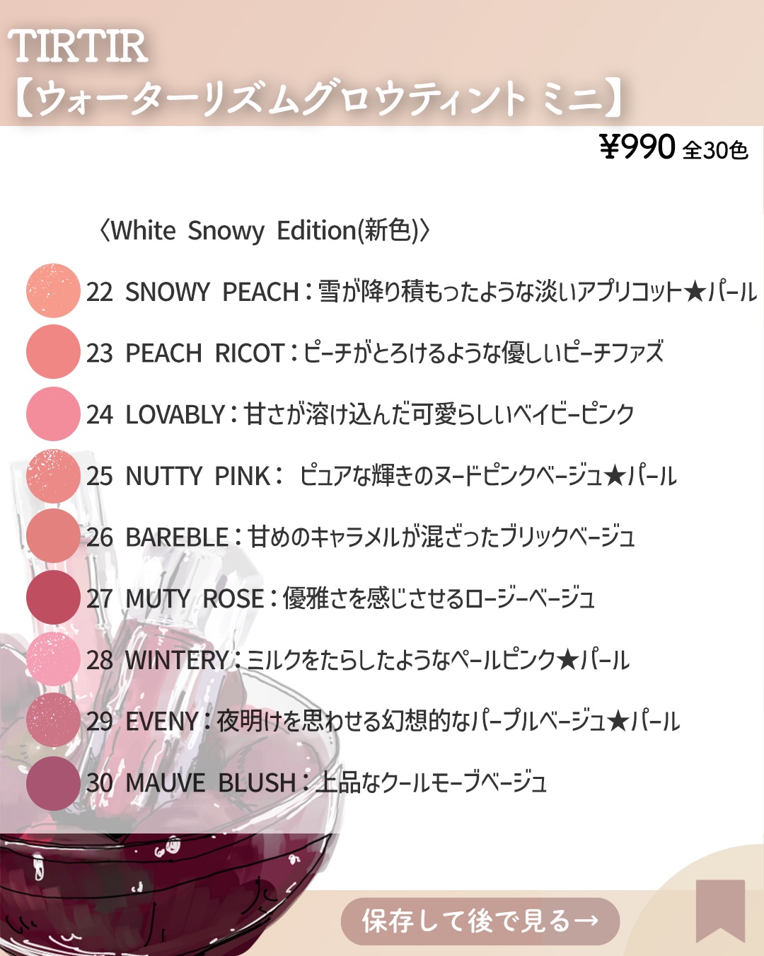 TIRTIRのティントがミニサイズになって カラバリも倍になって登場!! コンパクトで持ち運びやすく さらにカラーが15色→30色と倍に! パケめちゃめちゃ可愛いし 30色もカラバリあって絶対推しの1本に出会える🤍