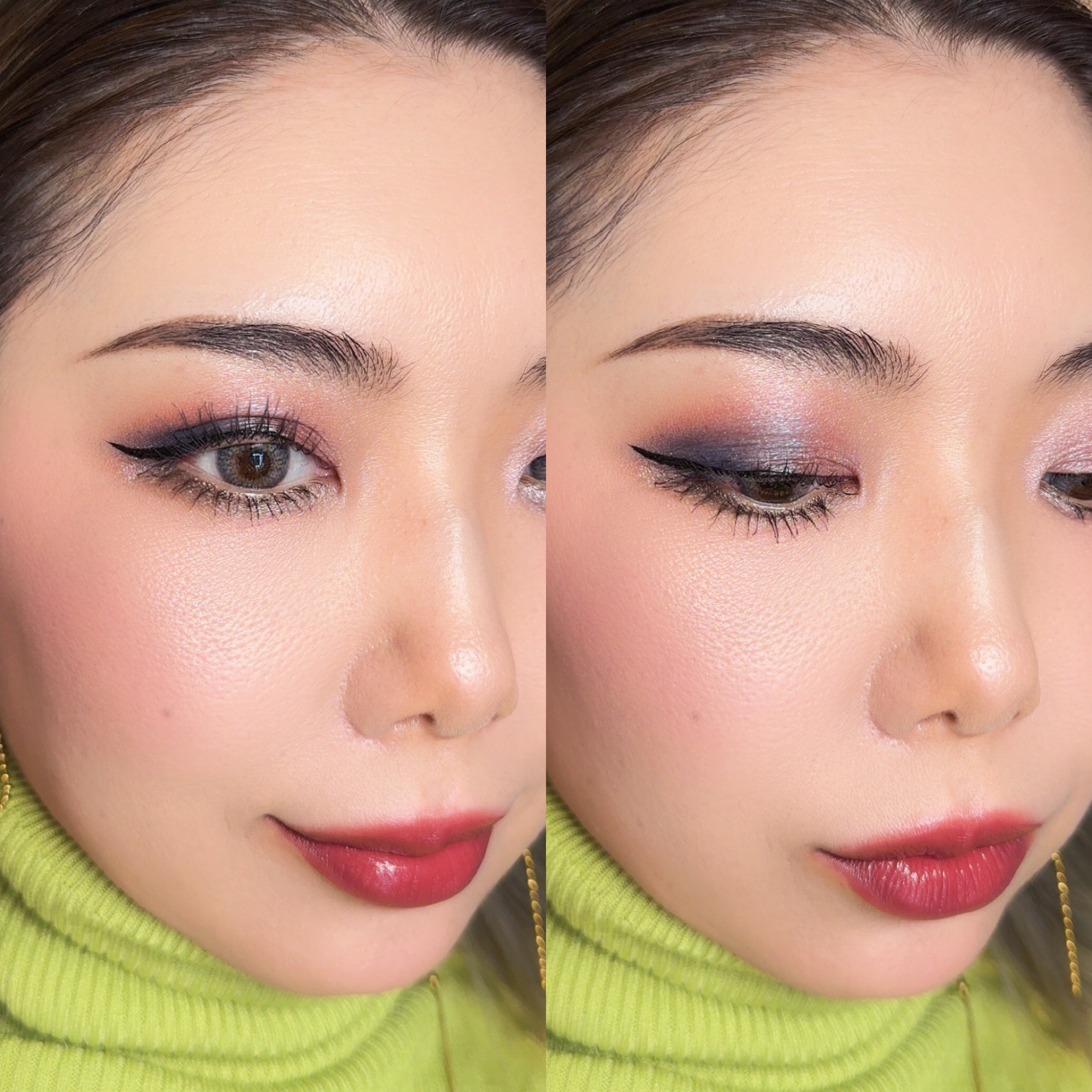 アイシーなピンクと水色のヘイローにしてみたよ🩷🩵やっぱりラメが可愛いパレット🥹✨✨ マットでベースを作ってから、同系色のラメを乗せたヘイローで、下まぶたは馴染みの良いようにベージュとピンクラメにシンプルに❣️ 雪の季節にやりたいメイクが出来たかな🤭☃❄