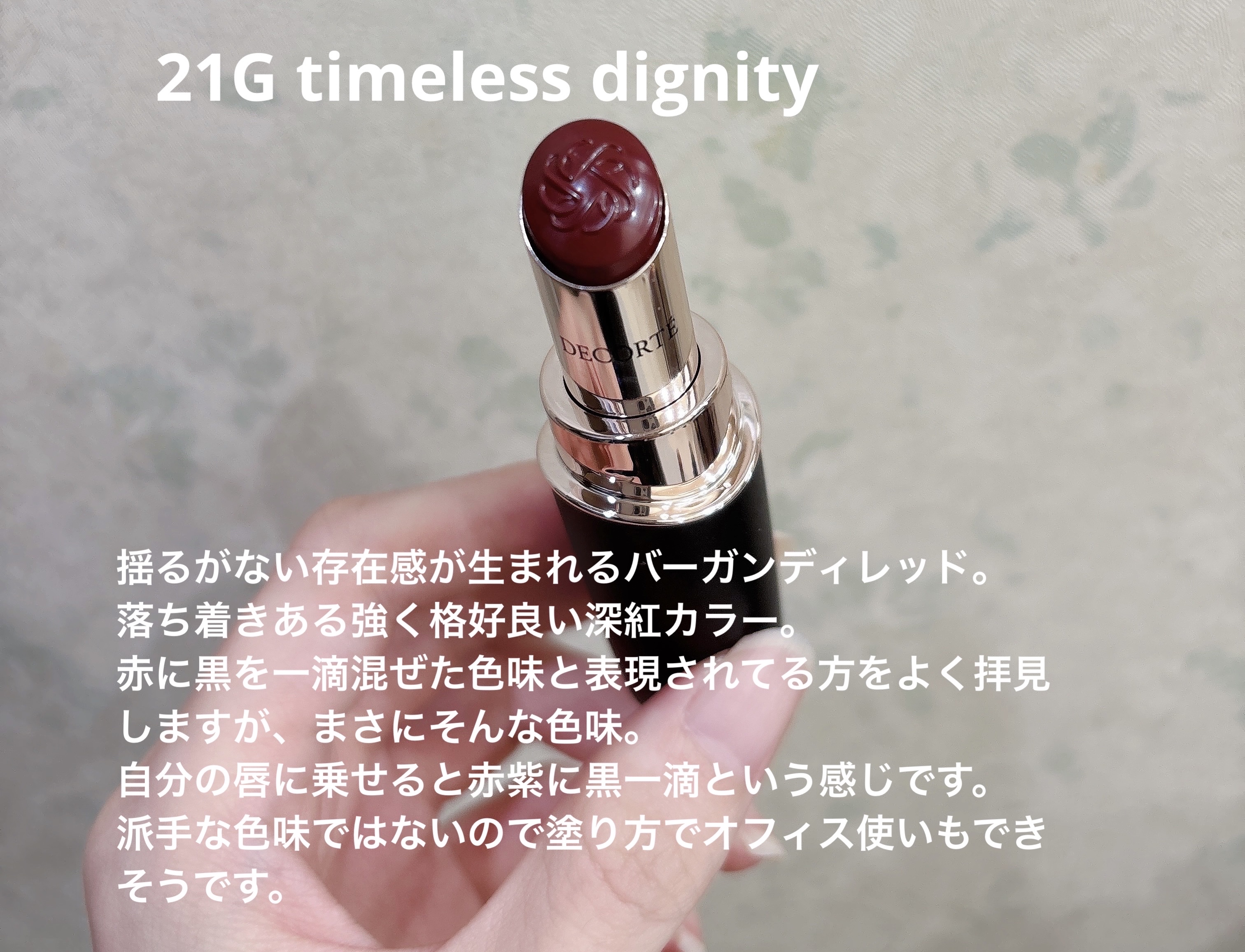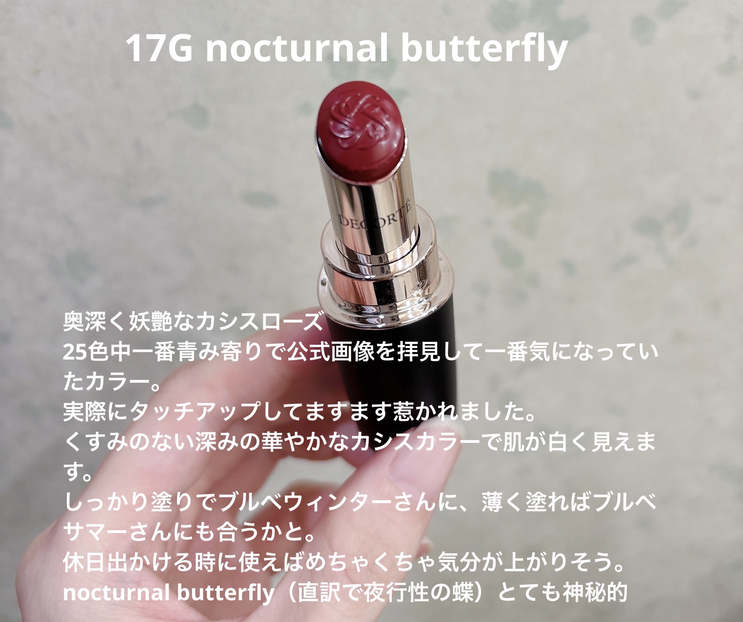 ブルベの自分には17、21がしっくり馴染みお気に入りになりました。 BA様いわく17G、21Gは人気色らしく公式HP、@コスメ等でも常に欠品していましたが地元のデコルテ様店舗に奇跡的に置いてありました; 塗り心地は摩擦レスでつるんとしてふっくらします。 旧作のものより高発色で伸び、色の馴染みが良いです。 肌と唇の血色感の延長線上にある色のみ どんな肌トーン、肌質も美しく魅せるために生み出された25色。