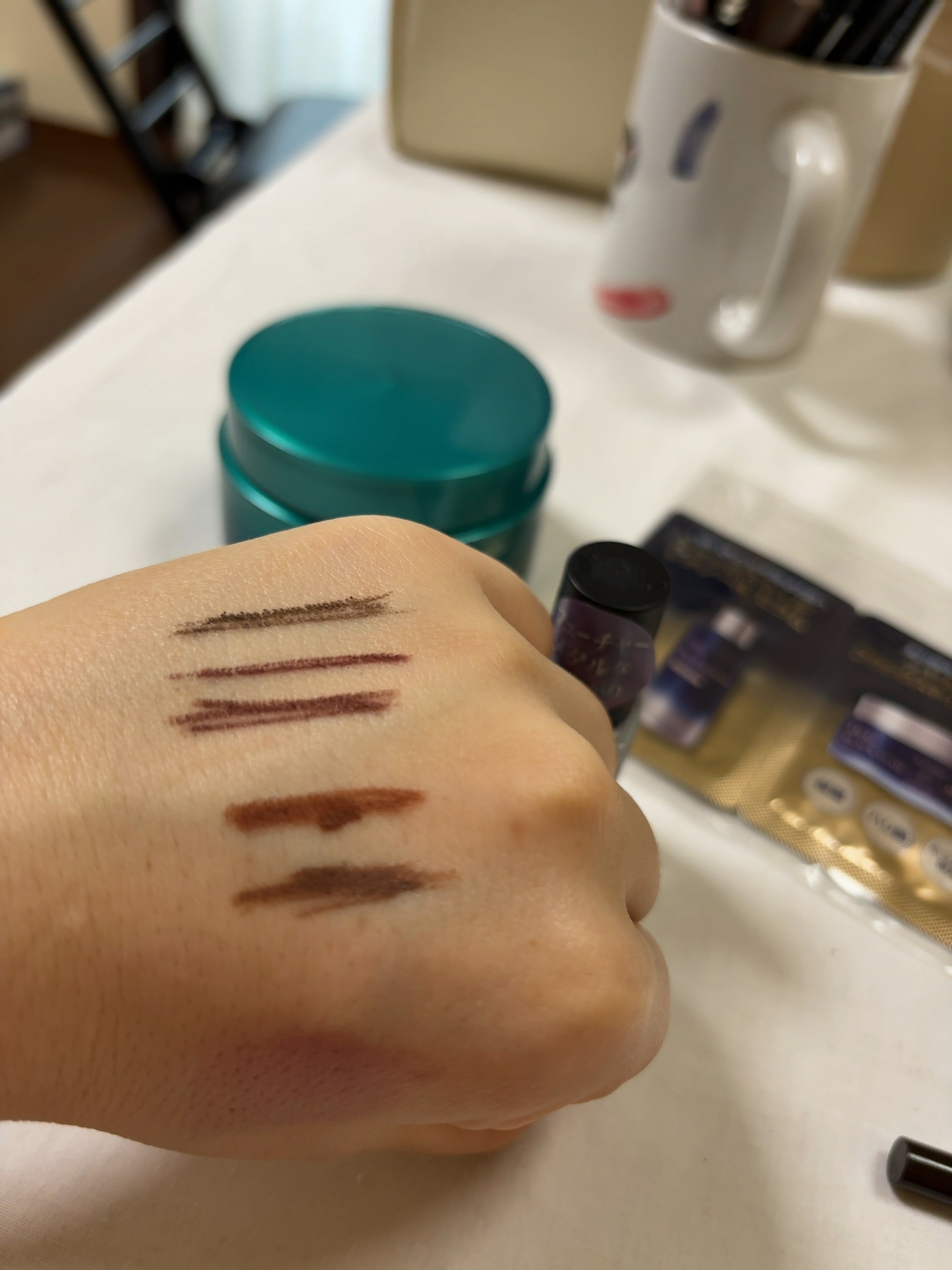 色はいいのよ。Q10の商品ページ通りです。キラキラして綺麗。 だけど、パール芯の方が硬くて、痛くて描けないわ。パンと張った丈夫な若い肌向きね。 あと、影を描く方、薄いから、かなり色白の私でも何度も書かないと見えないし、出てるのかな?って感じ。ぼかさなくていいんだけどね。 さらには、封があけたあとがあった…。元からシールで封して売っているわけでもなく。