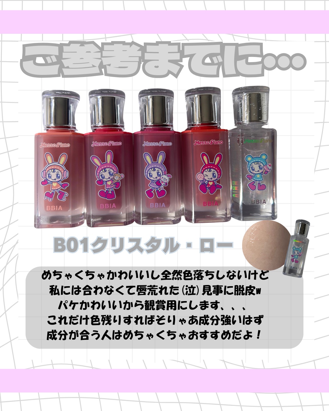 - - うるおいリップなのにしっかりカラーが定着し、時間が経っても塗りたてそのままのカラーを維持 *色が落ちにくいことから「飲み会リップ」としてSNSで話題に - 水のように軽くて快適なグロウティント、塗り重ねるほど鮮やかで透明に浮き上がる水彩画カラー - 香水瓶をイメージしたBBIA初のカスタムデザイン。パッケージはもちろん、カラーとテクスチャーに真心を込めて開発