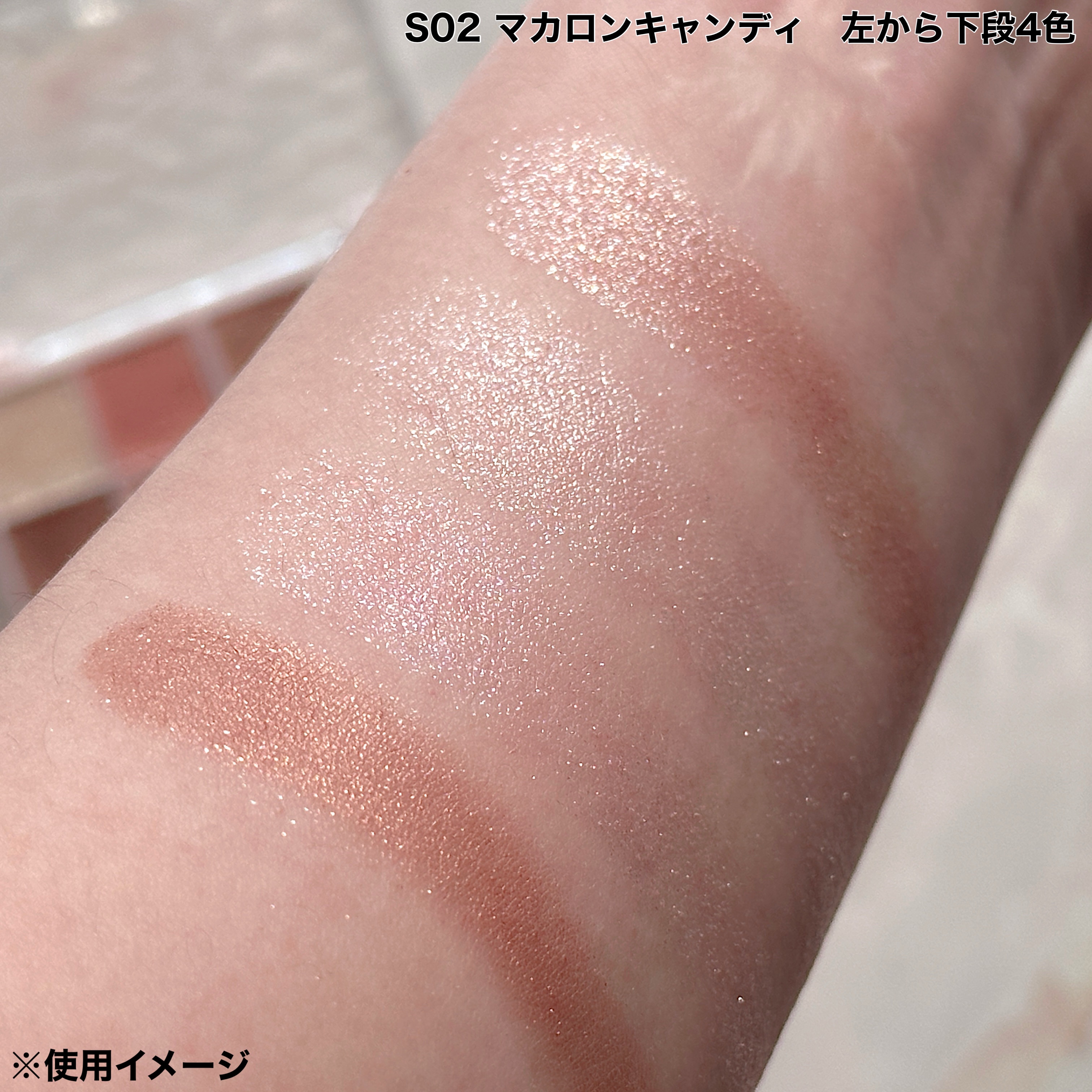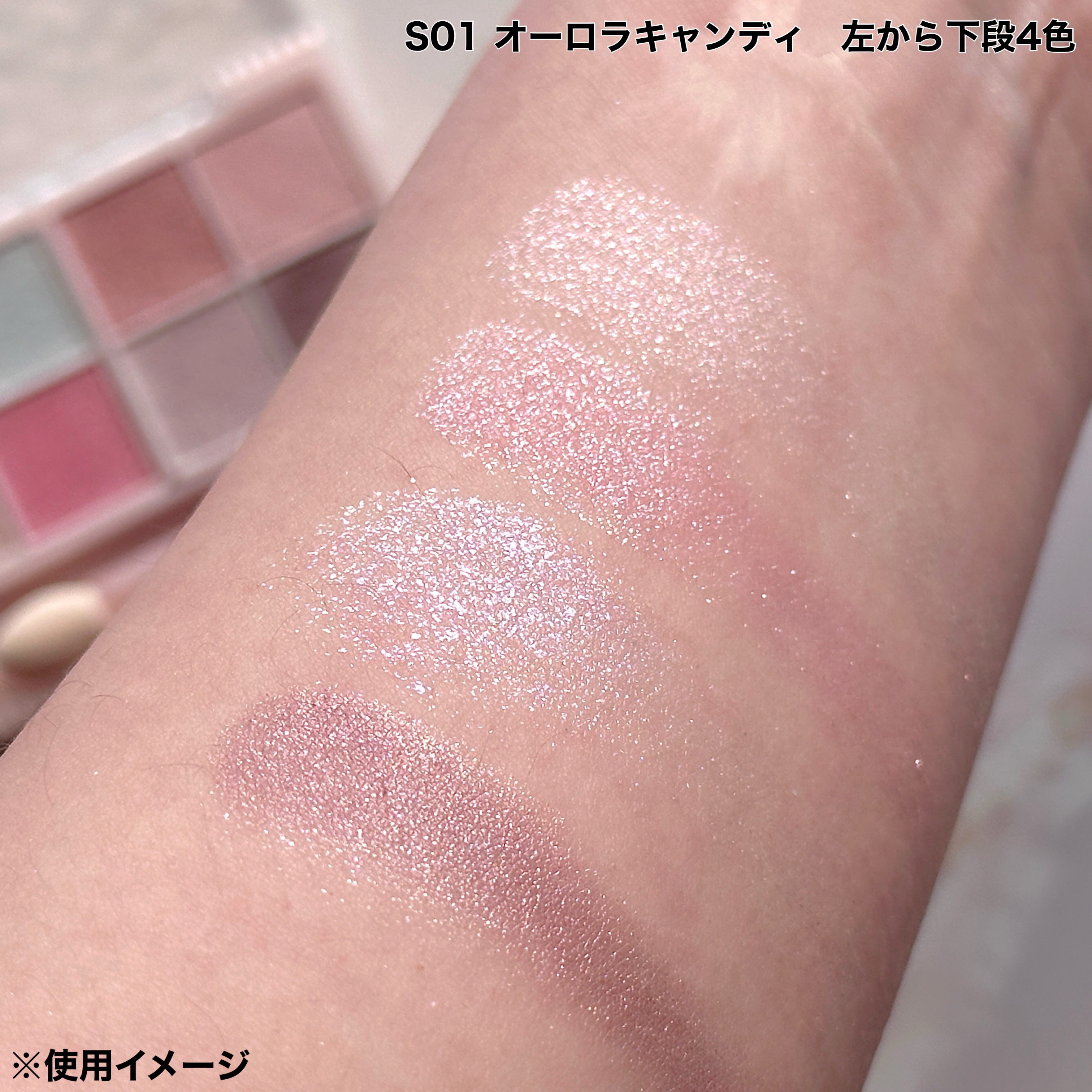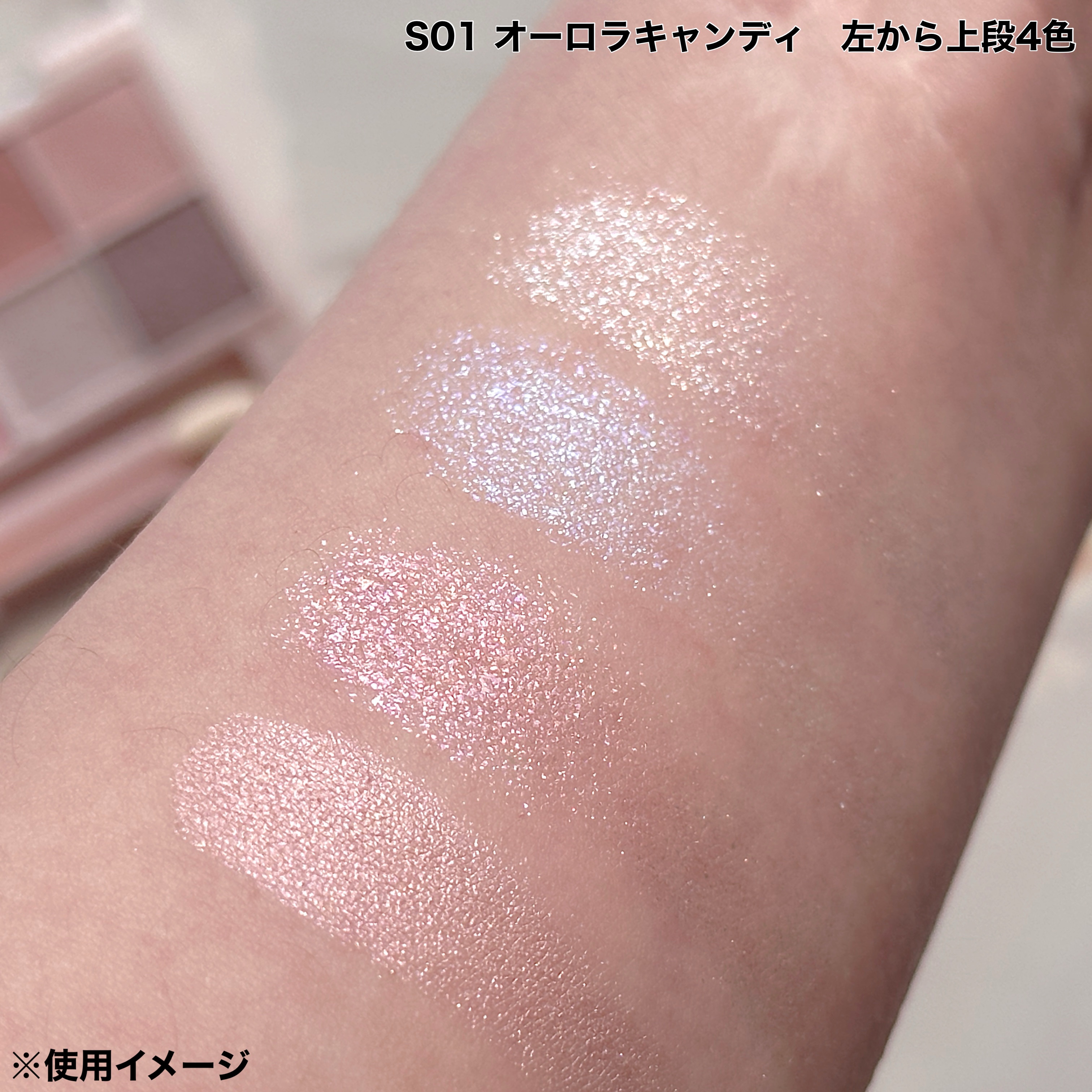 大人気のプティパレットアイズに待望のラメパレットが登場✨️✨️ コンパクトサイズで便利な激かわパレットにラメ6色+ベースカラー2色でキラキララメメイクが完成しちゃう! S01オーロラキャンディは青みカラーが揃った夢色パレット🩵 全体的に淡い色づきで透明感がある!特に水色のラメの発色が良くてとってもかわいい💕 S02マカロンキャンディは黄み系で使いやすいカラーが揃ってる! ベースカラーがしっかりした色づきでこちらは実用性が高いラメパレットという感じ