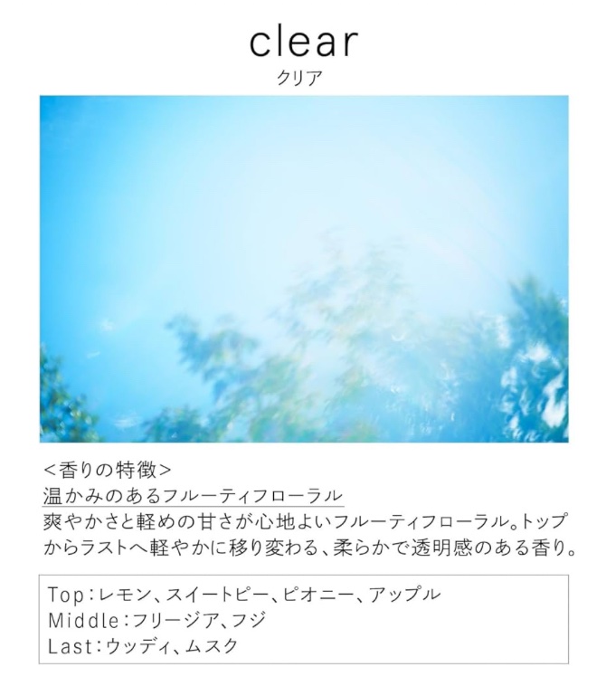 - 「青空のように可能性に満ちた香り。」 眩しいほどの青空を吸い込むように呼吸する朝。瑞々しいフルーティな明る さが覚醒させる香りは、今日を良い日にしてくれる。 Top レモン、スイートピー、ピオニー、アップル middle フリージア、フジ last ウッディ、ムスク