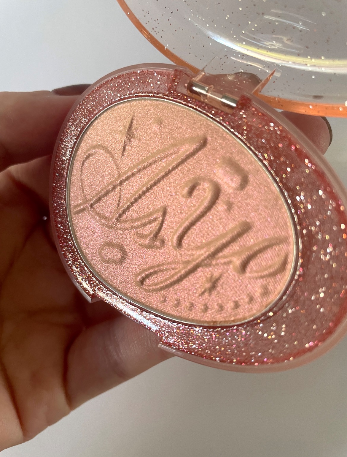 誕生石をモチーフにしたfweeの新作ハイライト💎 もう、外箱もパケも宝石みたいにキラキラでかわいすぎるんだが😍 肌馴染みよくて、角度によってはピンクにもオレンジにも見えるよ☺️ 偏光パールみたいなキラキラキラがかわいい〜✨ しっとりした粉質で粉飛びもしにくかった🙌