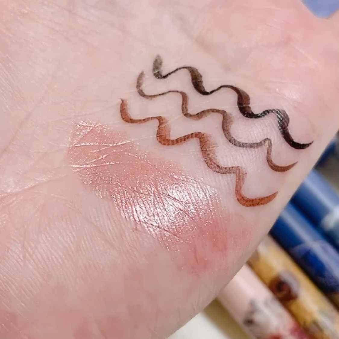 本体にね、油絵の絵の具のように凹凸のある絵画が描かれたデザインが大変素敵で🫶🏻 筆先端0.01mmの極細ラインでアイライン苦手な方におすすめ 涙袋にさっと入れるだけでうるみやばみなぷっくり涙袋が作れるしめっちゃ滲みにくくてメイクもちいいのさいこ〜!