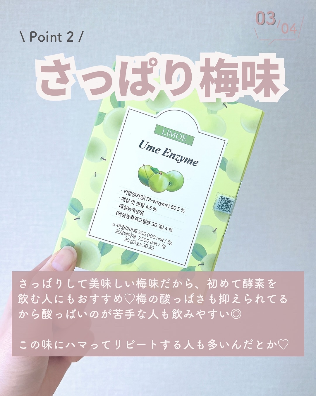 さっぱり美味しい梅味の酵素💚 自然発酵酵素60.5%配合✨️ 食事をスムーズに消化する消化酵素🫶🏻 なんといっても!味が美味しすぎる🫨💞 水なしでも口の中でサッと溶けてくれるのでいつでもどこでも💚 食べ過ぎた後の胃の重たさが軽減される♡ 夜に飲むと朝起きた時のスッキリ感があってとても気に入っています🥰