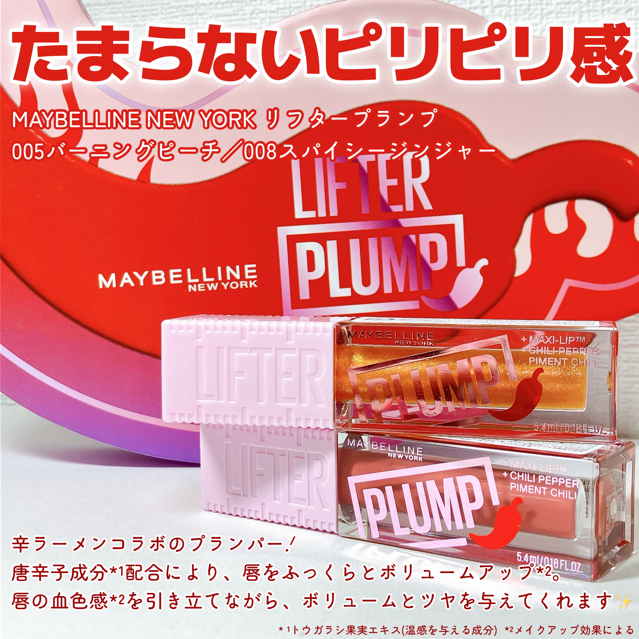 唐辛子成分配合 ビビッとくるボリューム感 あふれる血色感に燃えるツヤ色をプラス めちゃくちゃジンジンする!! ペリペラのプランパーも痛かったけど、リフタープランプも負けないくらい痛い🤣