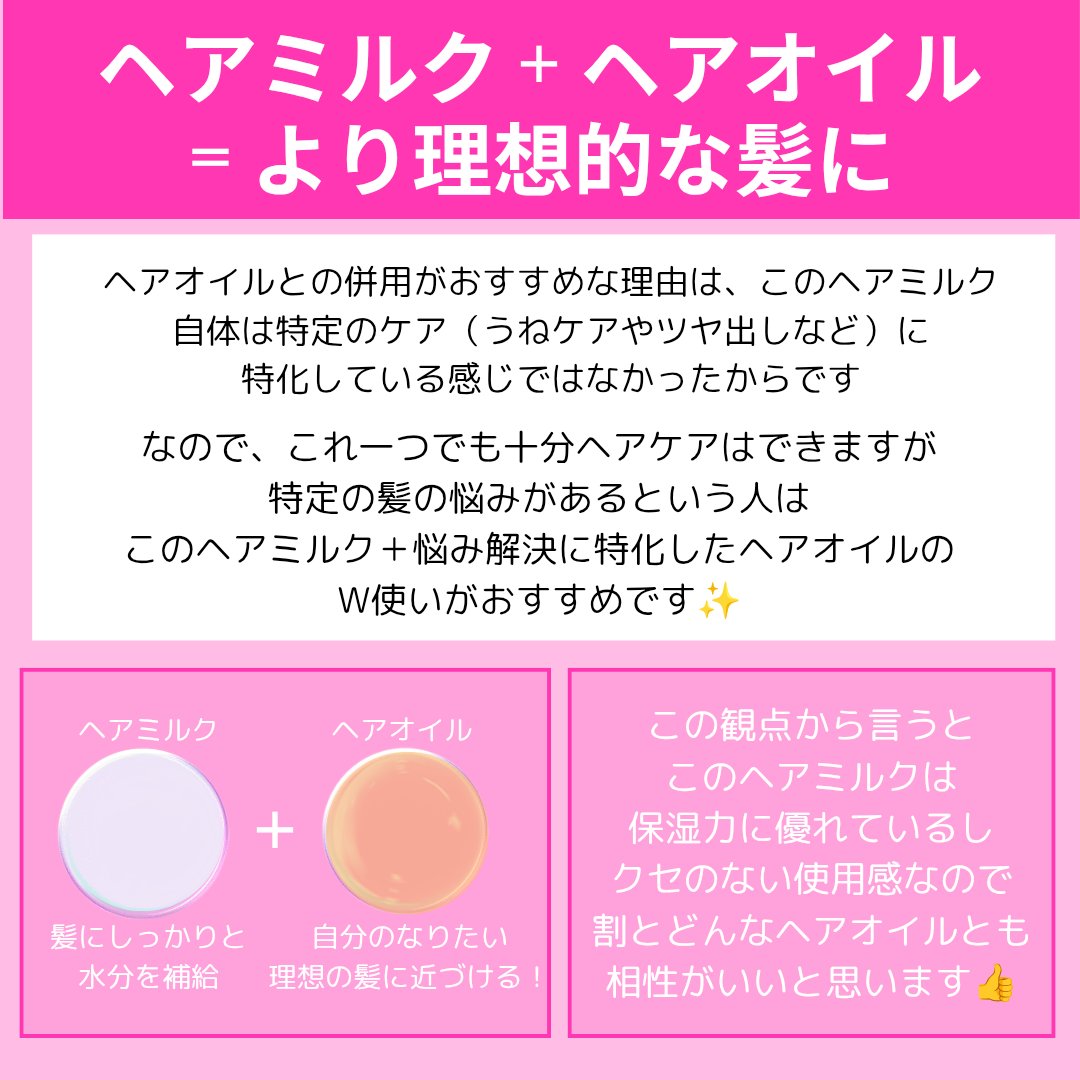| ヘアミルクランキング第194位 | 緩めのミルクで馴染みやすい♡ 乾燥を防いでまとまりやすい。カラーで傷んだ毛にも◎ | 詳細を見る | |