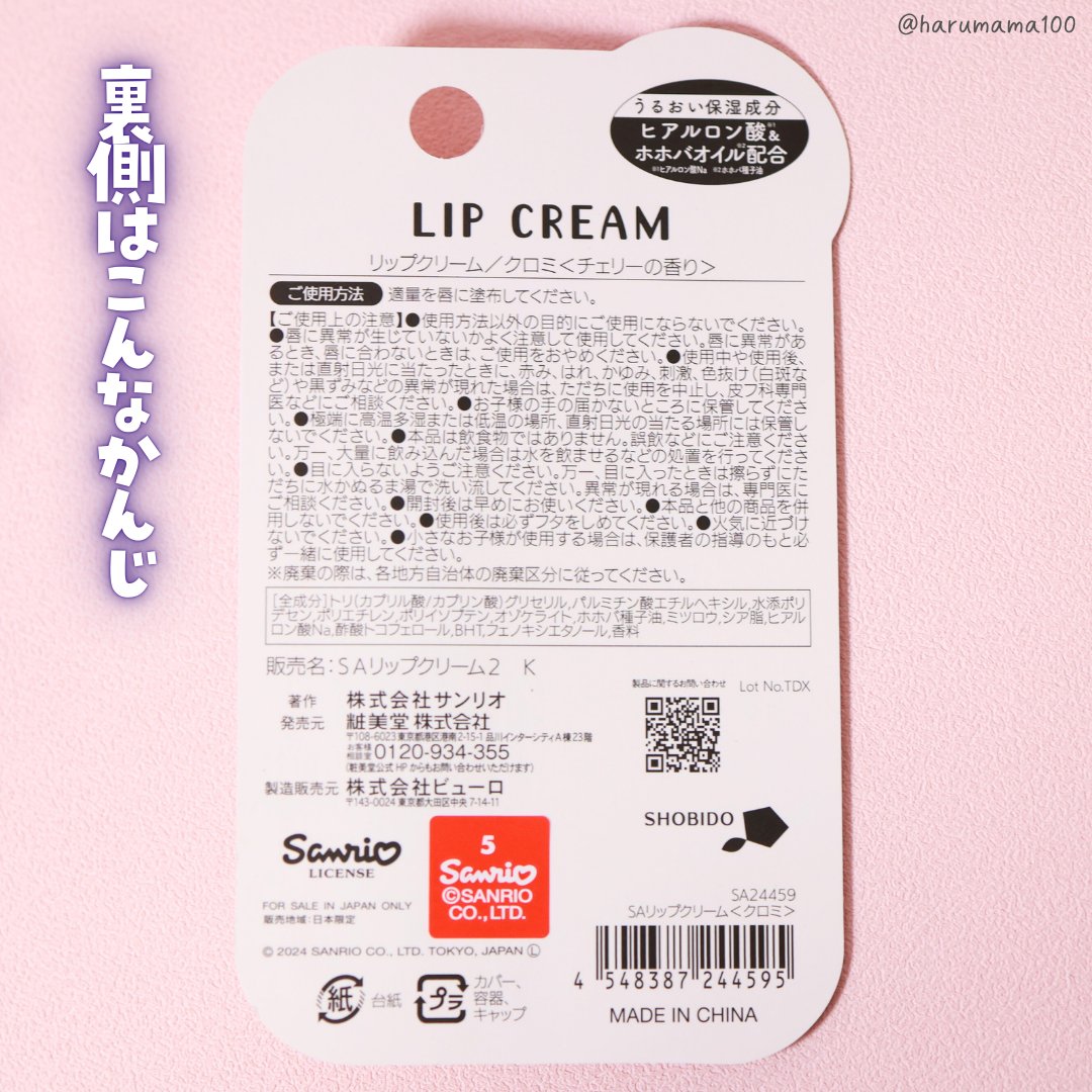 - クロミのデザインがキュートなリップクリーム。 うるおい保湿成分配合(ヒアルロン酸&ホホバオイル)で唇を乾燥から守ります。 <チェリーの香り>