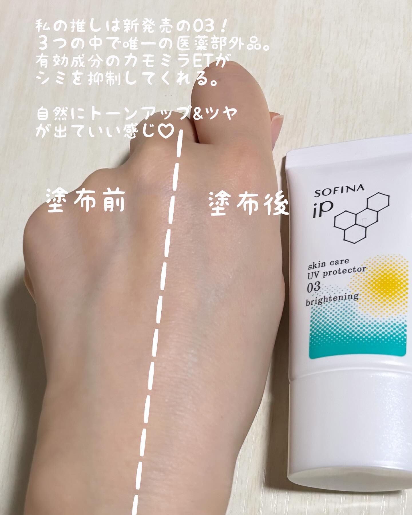 3種の肌環境で選べるスキンケアUV☀️ 01は水分補給UV、02はオイルコントロールUV、03はシミ予防UVになってるよ! 私のお気に入りは、03💚 有効成分カモミラETを配合。 乾燥してくすんだ肌に潤いを与えて、塗ったそばから均一でつややかな状態に導いてくれる🫶 塗布後の肌の肌全体が透明感のある自然な明るい仕上がりで美肌感を上げてくれるよ✨