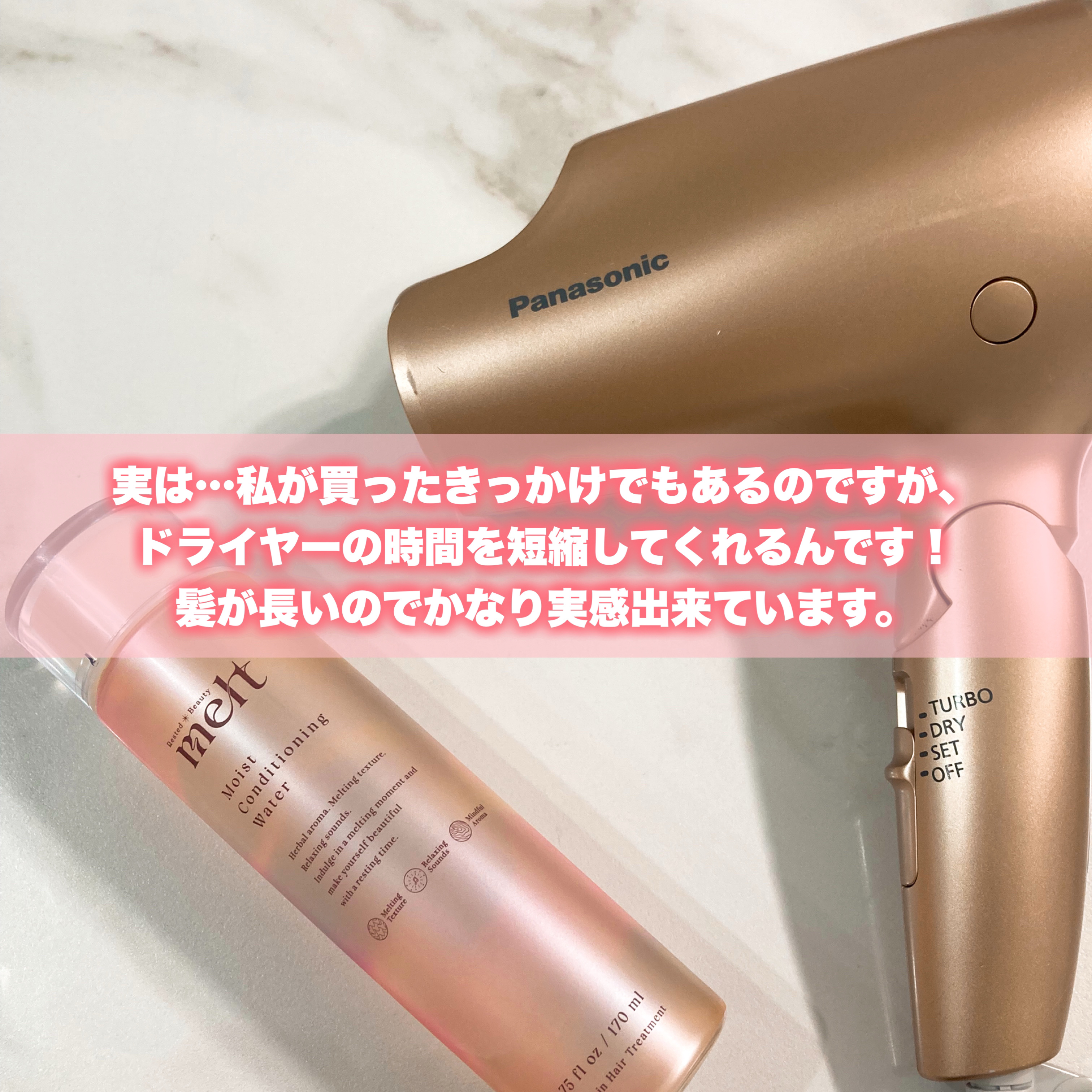 ドン・キホーテで買ったよー💖meltメルトモイストコンディショニングウォーター前にドンキのコスメフェスティバルに参加させて頂いて、その時にmeltさんのブースでめちゃくちゃ気になってた紙の化粧水✨️これ使うとドライヤーが時短できるって聞いてそ...