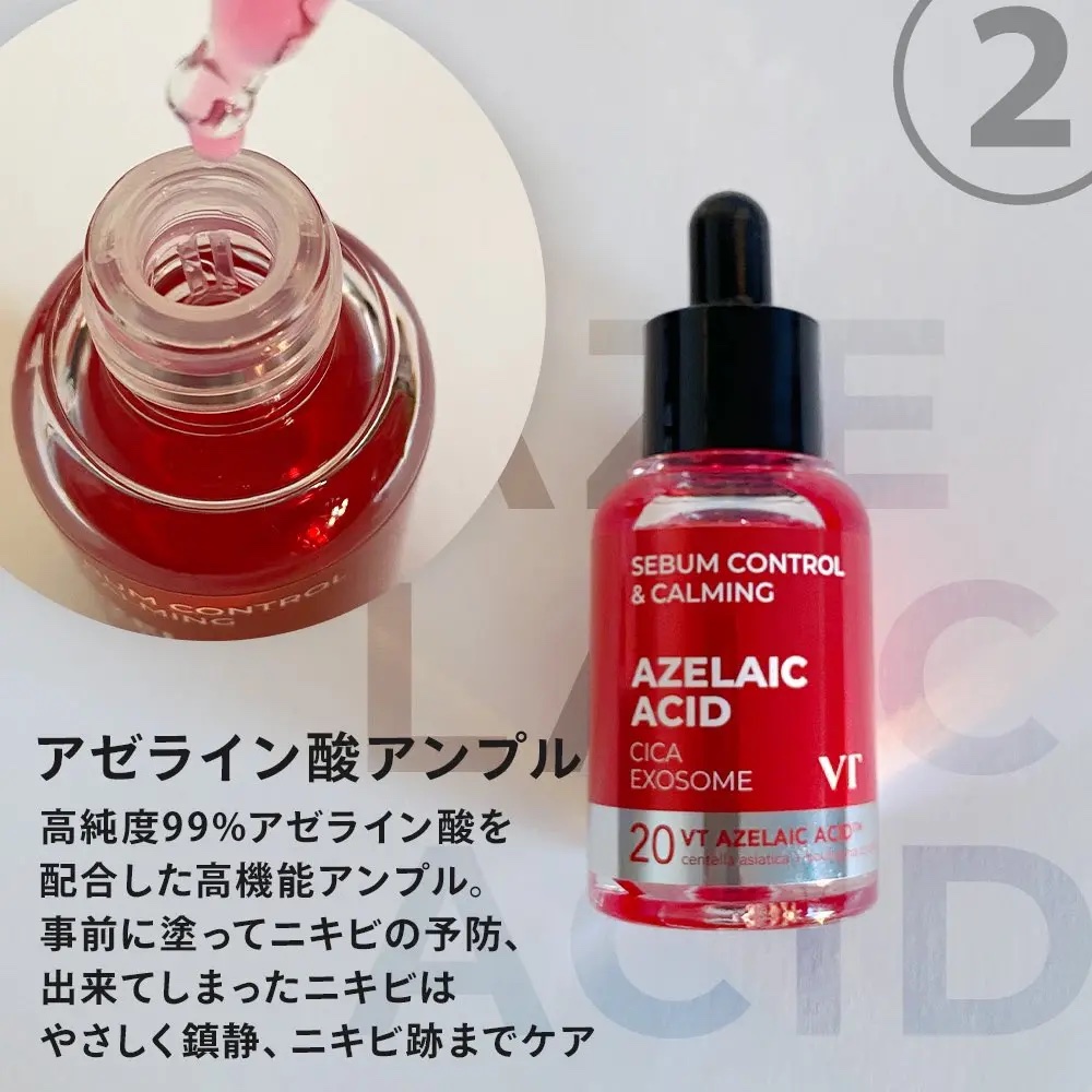 アゼライン酸はニキビ予防、ニキビ跡トラブルケア、毛穴ケアや皮脂ケアにも効果が💡 VTのアゼライン酸アンプルは高純度99%配合✨ さらにCICAエクソソーム入りで、ニキビ&鎮静ケアもしてくれます🪄 サッパリとした使用感でメイク前にも使いやすかった💫 角質ケアに有効な成分配合で毎日手軽にケアできるからお気に入り♡