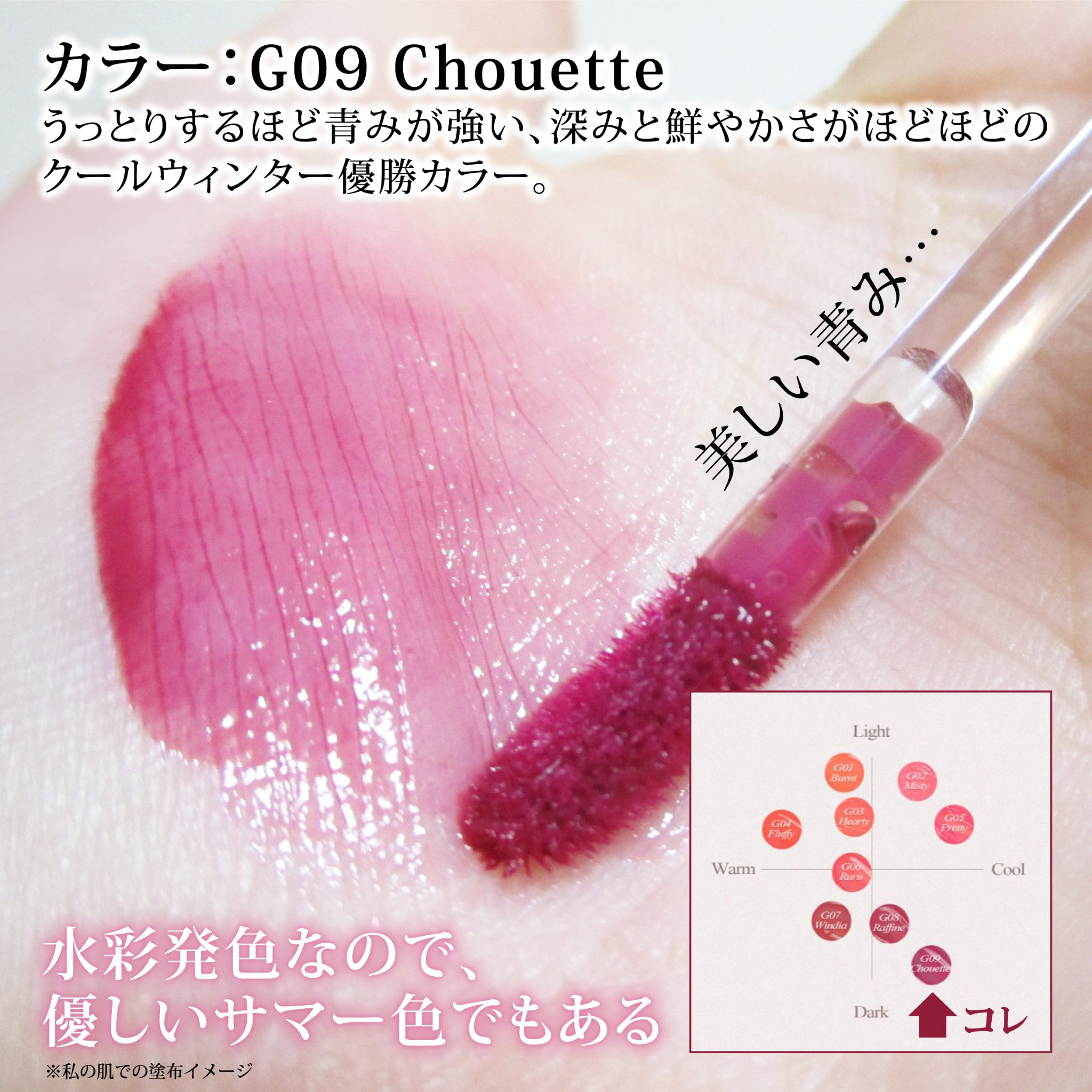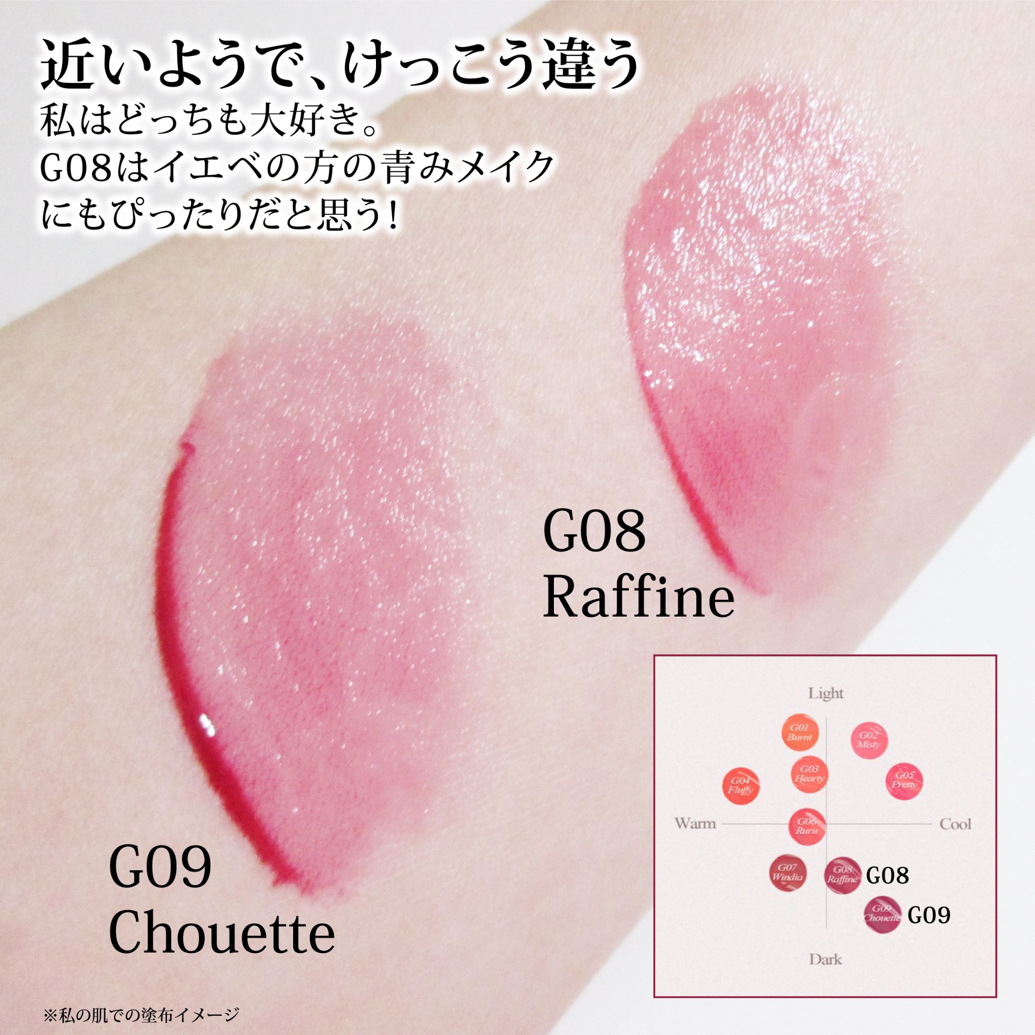 透き通るように輝く水光ツヤが特徴で、ベタつかず、重ね塗りしても軽やかなテクスチャーが魅力です。 05 Pretty は明るく可愛らしいブライトピンクで、華やかな印象を演出。08 Raffine は深みのあるプラムローズで、落ち着いた大人の雰囲気を引き立てます。 みずみずしいツヤ感がありながら、大人でも取り入れやすい仕上がり。