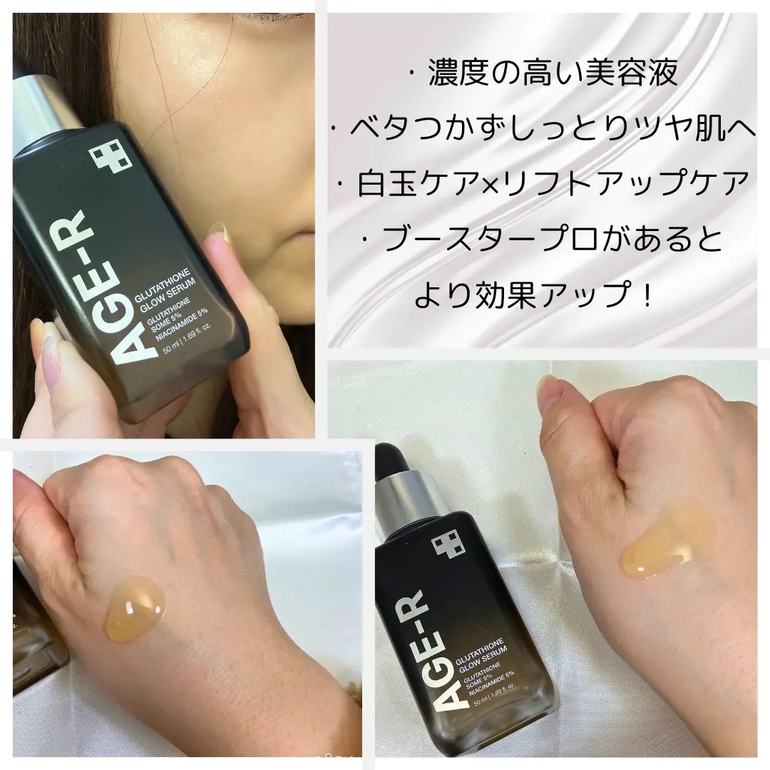 - 高純度99.4%のグルタチオン*を配合し、ハリツヤ肌に導く美容液です。 肌に馴染みやすいリン脂質製のカプセルにグルタチオン成分*を閉じ込め、肌の角質層までうるおいで満たします。 ☑グルタチオンソーム*:50,000ppm ☑ナイアシンアミド* 5%配合 ☑べたつかずしっとりツヤ肌 ☑美顔器AGE-R スキンブースターショットと一緒に使えます 化粧水などでお肌を整えたあと、適量を取り、お肌のキメに沿ってまんべんなく塗った後、やさしくなじませます。 *保湿成分 ■お肌に異常が生じていないかよく注意してご使用ください。化粧品がお肌に合わないとき即ち次のような場合には、使用を中止してください。そのまま使 用を続けますと、症状を悪化させることがありますので、皮膚科専門医等にご相談されることをおすすめします。また、傷やはれもの、しっしん等の異常が ある部位には、ご使用にならないでください。 (1)使用中、赤味、はれ、かゆみ、刺激、色抜け(白斑等)や黒ずみ等の異常があらわれた場合 (2)使用したお肌に、直射日光があたって上記のような異常があらわれた場合 ■目に入らないようご注意ください。目に入ったときは、こすらずにすぐに洗い流してください。その後、目に異物感など異常が残る場合は、眼科専門医へ ご相談されることをおすすめします。 ■極端に高温又は低温の場所、直射日光のあたる場所には保管しないでください。 ■開封後なるべく早めに使用してください。 ■ご使用後はフタをきちんと閉めてください。 ■乳児、子供の手の届かない所に保管してください。