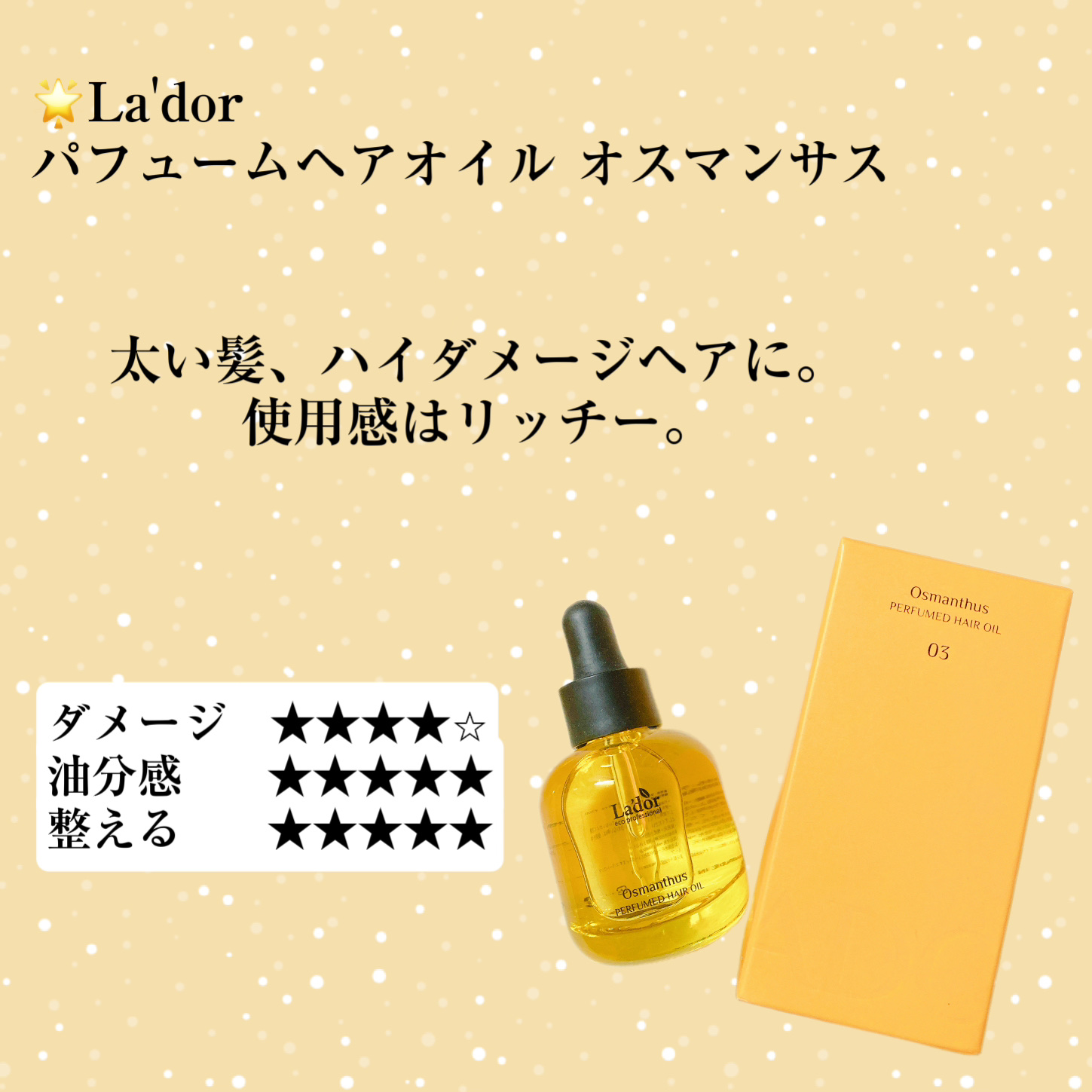 韓国発!元美容師が本気で作ったヘアオイル @cosme東京・大阪にてポップアップ開催& 韓国ソウルのトレンドスポット「聖水(ソンス)」で2025年2月にストアオープンと、今大注目&熱いコスメブランド「La'dor(ラドール)」🔥 最大の特徴は、ネーミングの「パフュームヘアオイル」 の通り、香水級の豊かな香りを楽しめること♥️ 塗布直後は、結構がつんと香りますが時間が経つと、そっと髪を包み込むように余韻を残す…優しい香りに。 テクスチャーは3段階選べるのですが、どれもベタつきゼロ♥️ さらりと「羽のように軽い」仕上がりと髪馴染みがとても良いので、「さらんするん」な艶髪を…