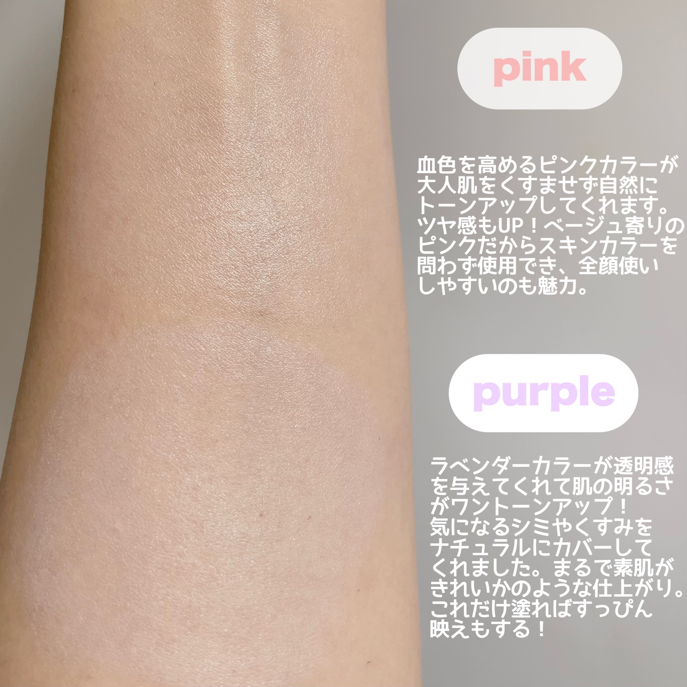 肌のくすみを補正して、素肌のように自然なトーンアップができるˊ˗ しっとりとした血色感のあるツヤ肌が好きな方におすすめ! 紫色のコントロールカラーで肌の黄ぐすみをカーバしながら透明感を引き立ててくれるˊ˗ 白浮きのない素肌のようなトーンアップでサラッとした仕上がりが好きな方におすすめ! ツヤ好きの私はいつも🩷をリピしていますが、今回💜を使ってみてまた違った良さがあって 使い分けていきたいと思います♩