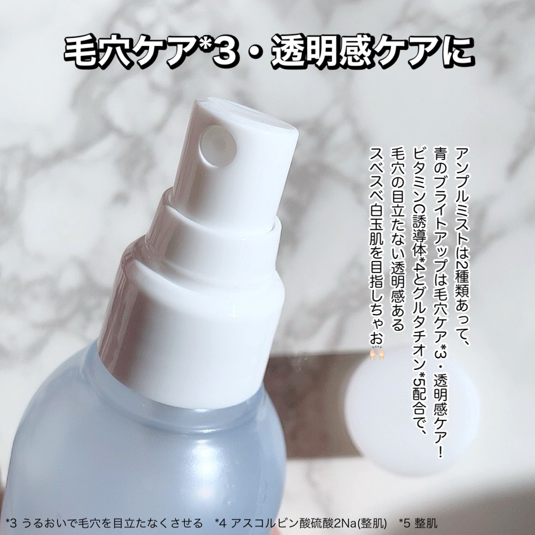 - 濃密美容液を微細化したミストタイプの美容液です。美容成分※1配合の毛穴より小さい1万粒※2のミストが、洗顔後のまっさらな肌にダイレクトに届き、角層内部にアプローチします。 ビタミンC誘導体※3とグルタチオン※4配合で、毛穴の目立たない透明感あるスベスベ白玉肌へ導きます。 美容液と化粧水の工程を1本でシンプルにケア。 オイルフリー。 ※1 整肌・保湿 ※2 1プッシュあたり ※3 アスコルビン酸硫酸2Na(整肌) ※4 整肌