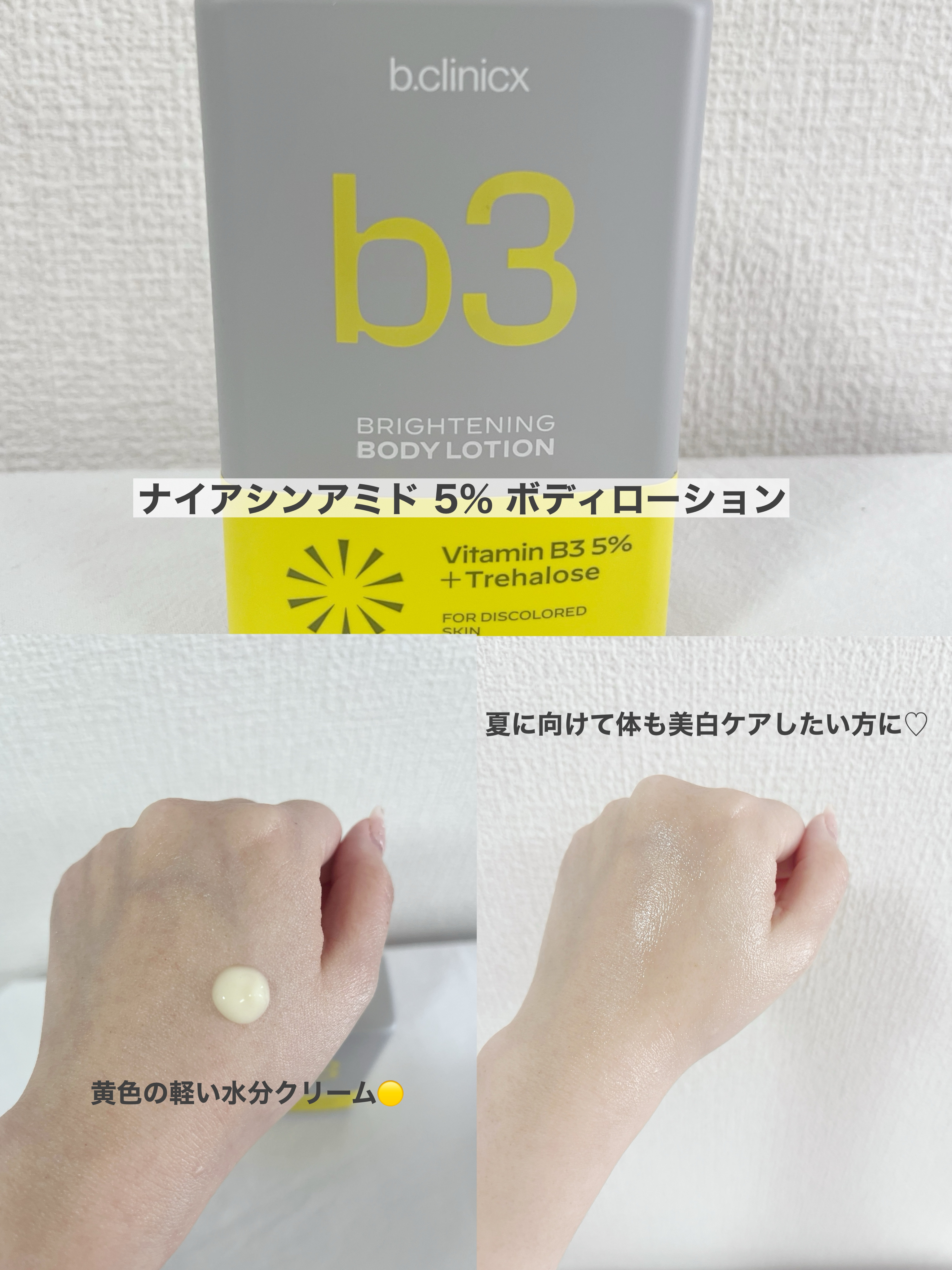 ナイアシンアミド5%配合の肌トーンケアに使いたいボディローション✨️ 黄色の軽〜い水分クリームでベタつかないさっぱり爽やかなゲルタイプのテクスチャー✨ レモンシトラスの香りとテクスチャーが特にお気に入り🥹