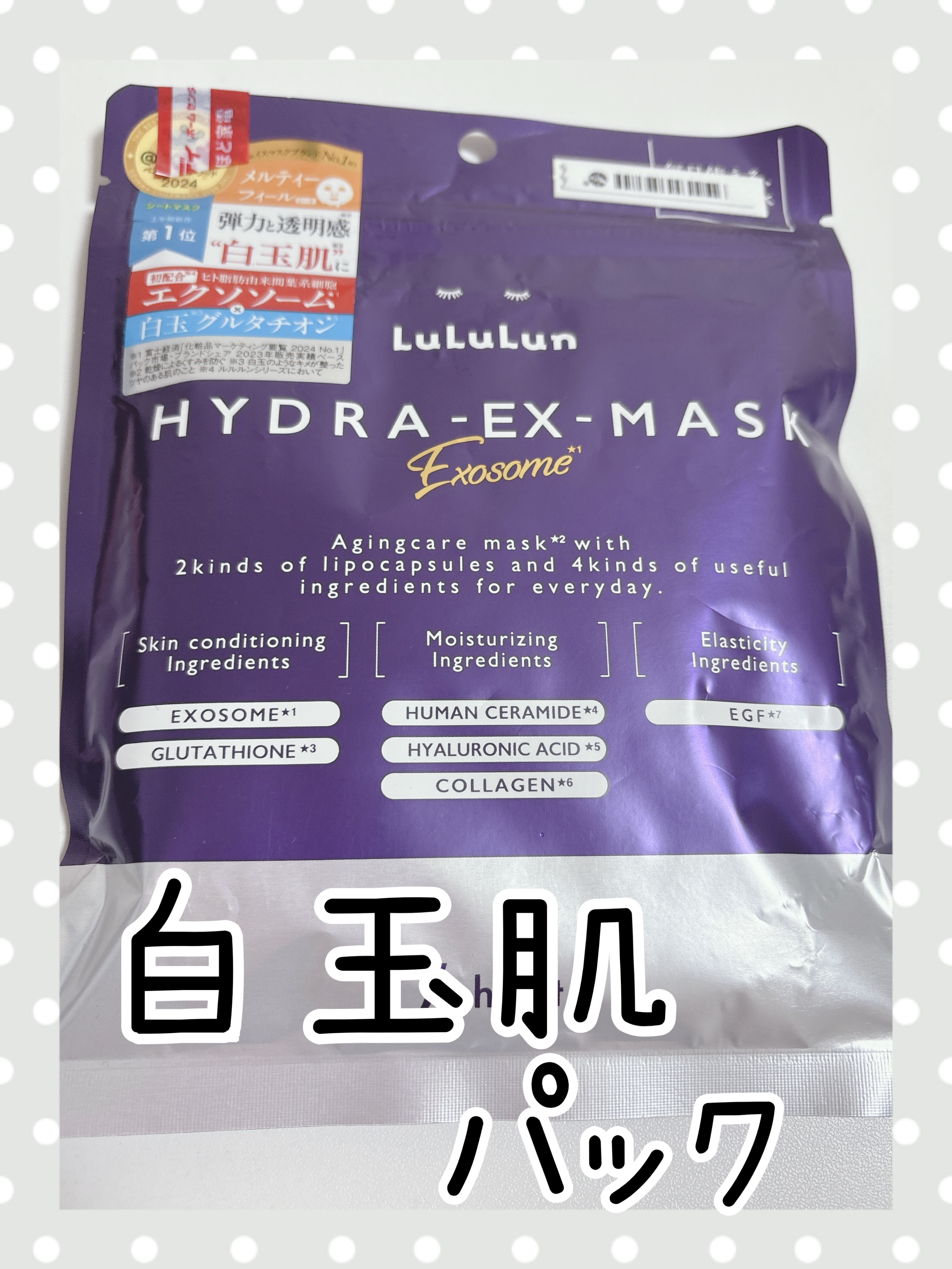 - ルルルンハイドラシリーズから新登場。うるおいにプラスするのは、「エクソソーム*1」。先端再生テクノロジーにインスパイアされた、デイリーエイジングケア※1マスクです。白玉※2グルタチオン*2をプラス配合し、弾力・透明感※3・つやめきのあるなめらかなお肌へ導きます。 (*1 整肌成分 ヒト脂肪由来間葉系細胞エクソソーム *2 整肌成分 グルタチオン、アルブチン、レシチン ※1 年齢に応じて肌へうるおいと弾力を与えるケアのこと ※2 白玉のようなキメが整ったツヤのある肌のこと ※3 うるおいを与えて、乾燥によるくすみを防ぐ)