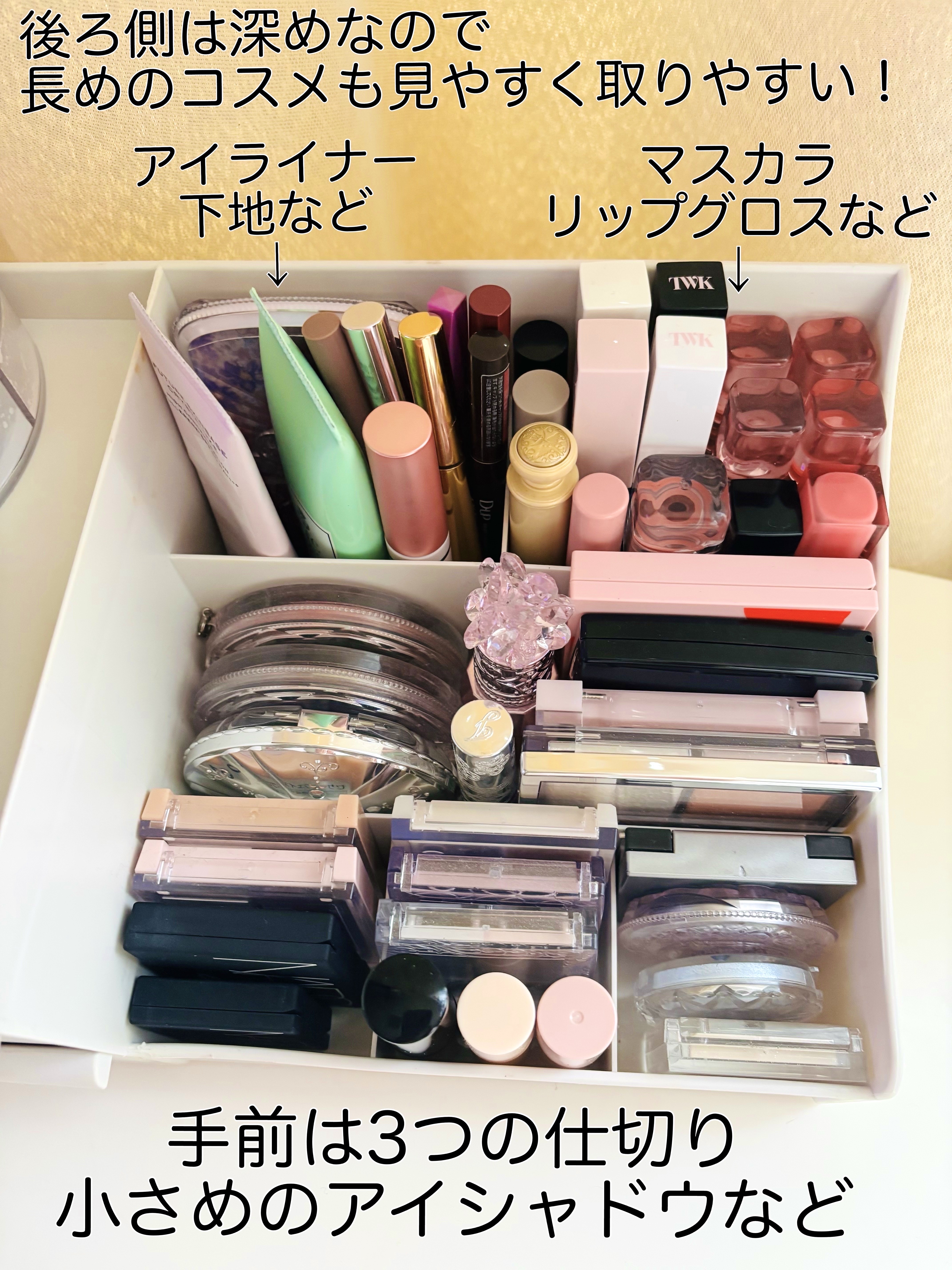 机の棚の二段に分けてコスメを置いてます ✨ 下段にベースメイクやカラコン、リップ、アイライン、小さいパケのアイシャドウ等 上段のは3COINSのクリアドレッサーです !! クリアドレッサーは鏡付きなので持ち運んでどこでもメイクができます !! 本当は下段のスペースがもったいないなと 思っているのでいいのないか探しています 🤔