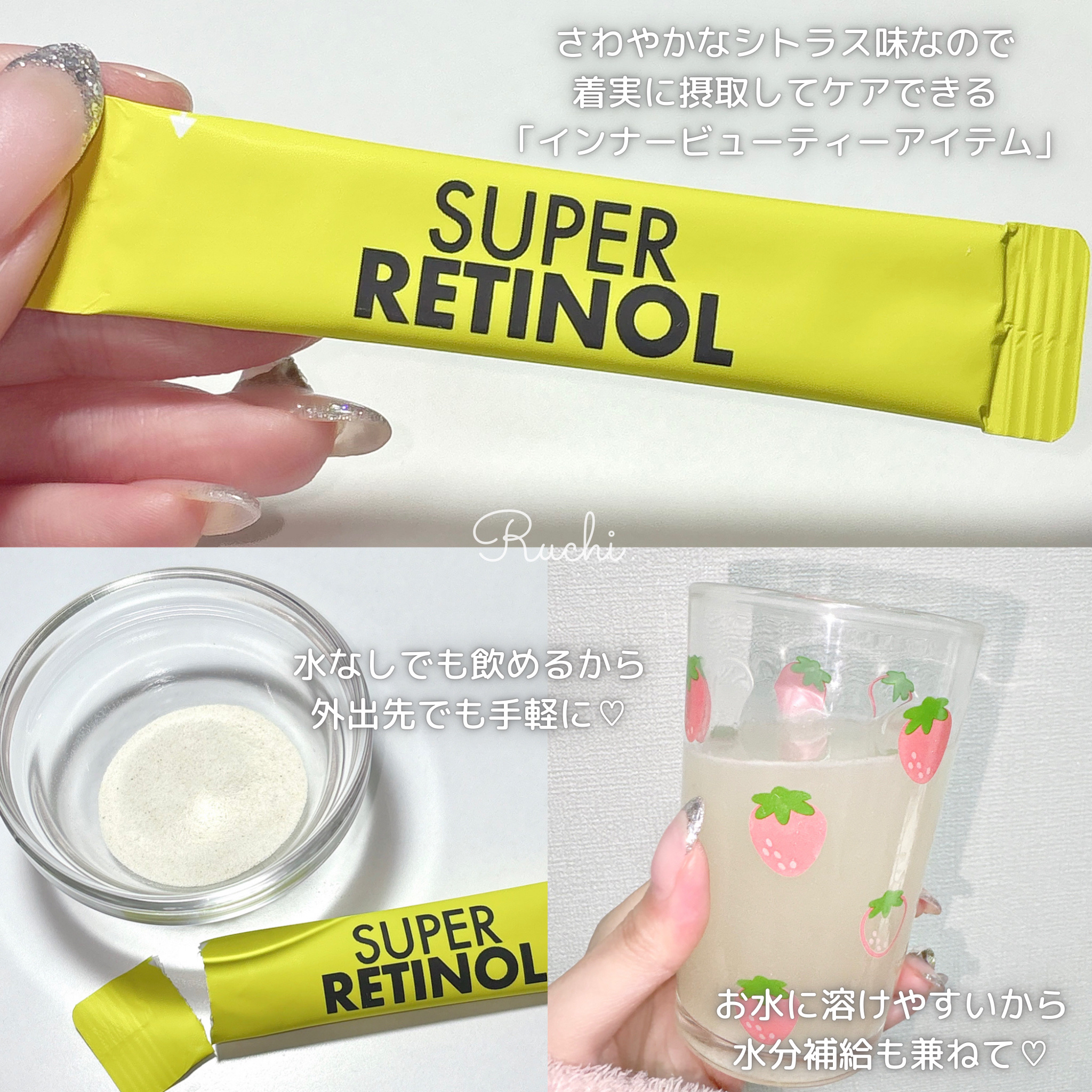 肌の敏感度に関係なく、誰でも摂取できる「食べるレチノール」 レチノールって敏感肌の人だと使うの躊躇するイメージある👀 これ一つでビタミン系の補給ができるの 効率良くない?! 味もさわやかなシトラス 飽きないし、飲みやすい。