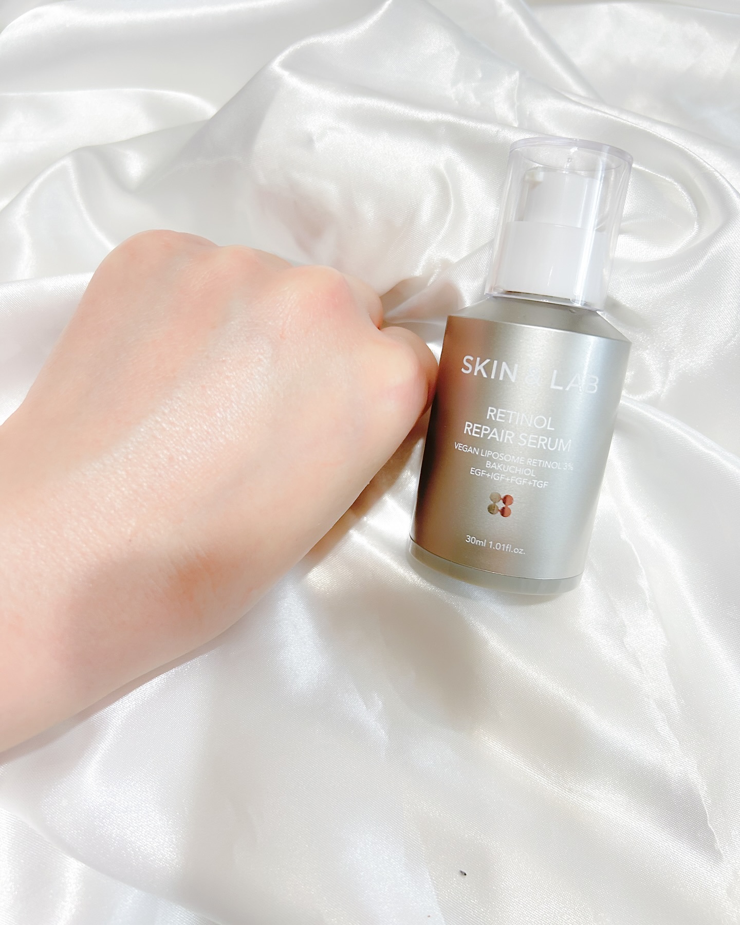 植物性で刺激を減らしたヴィーガンリポソームレチノール。3月に発売したSKIN&LABの新商品! 毛穴より238倍小さいヴィーガンリポソームレチノールが3%配合され、メラニンの生成を抑えしみそばかすを防ぎ、毛穴ケアや肌ハリをアップしてくれるセラム 柔らかいテクスチャーのクリーム様のセラム。すーっと伸びて肌馴染みがよく、ベタつかない使用感で心地よいです。
