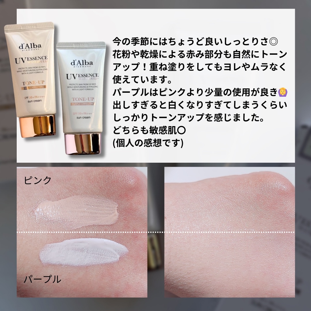 みずみずしく伸びるテクスチャーで、しっとりとした保湿感で上品なツヤ肌しあがり✨ 日焼け止めとしても優秀で、白桃色で自然にトーンアップする人気下地🌞 サラっとしたしあがりに。肌の黄ぐすみを飛ばしてくれるUV下地🌞 透明感求める私はパープルカラーはマスト! ベタつかずサラッとしてて快適◎
