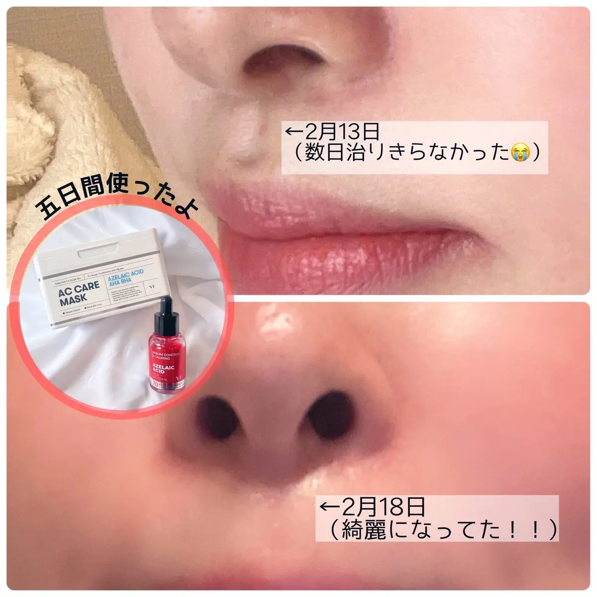鼻の下にできた激痛ニキビが、このアンプル&パックのおかげかわからないんだけど、5日で落ち着いた..!! 敏感肌の私もひりつき特になしだったので、効果出すためにVTの導入ニードル美容液のあとにパックして使ってるよ。 高純度99%アゼライン酸配合で、ニキビ予防に効果的みたい!
