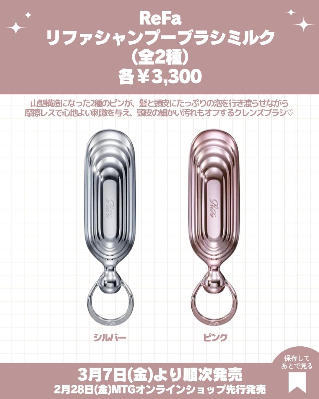 リファハートコーム アイラ(新3色)各¥2,970 ・シャインレッド ・アクアブルー ・エメラルド リファ ハートブラシ(限定1色)¥3,300 ・シルバースカイ(MTG Amazon公式ストア限定) リファミルクプロテインシャンプー ピンク 500mL ¥1,980 →リファミルクプロテイントリートメント ピンク 500g ¥1,980