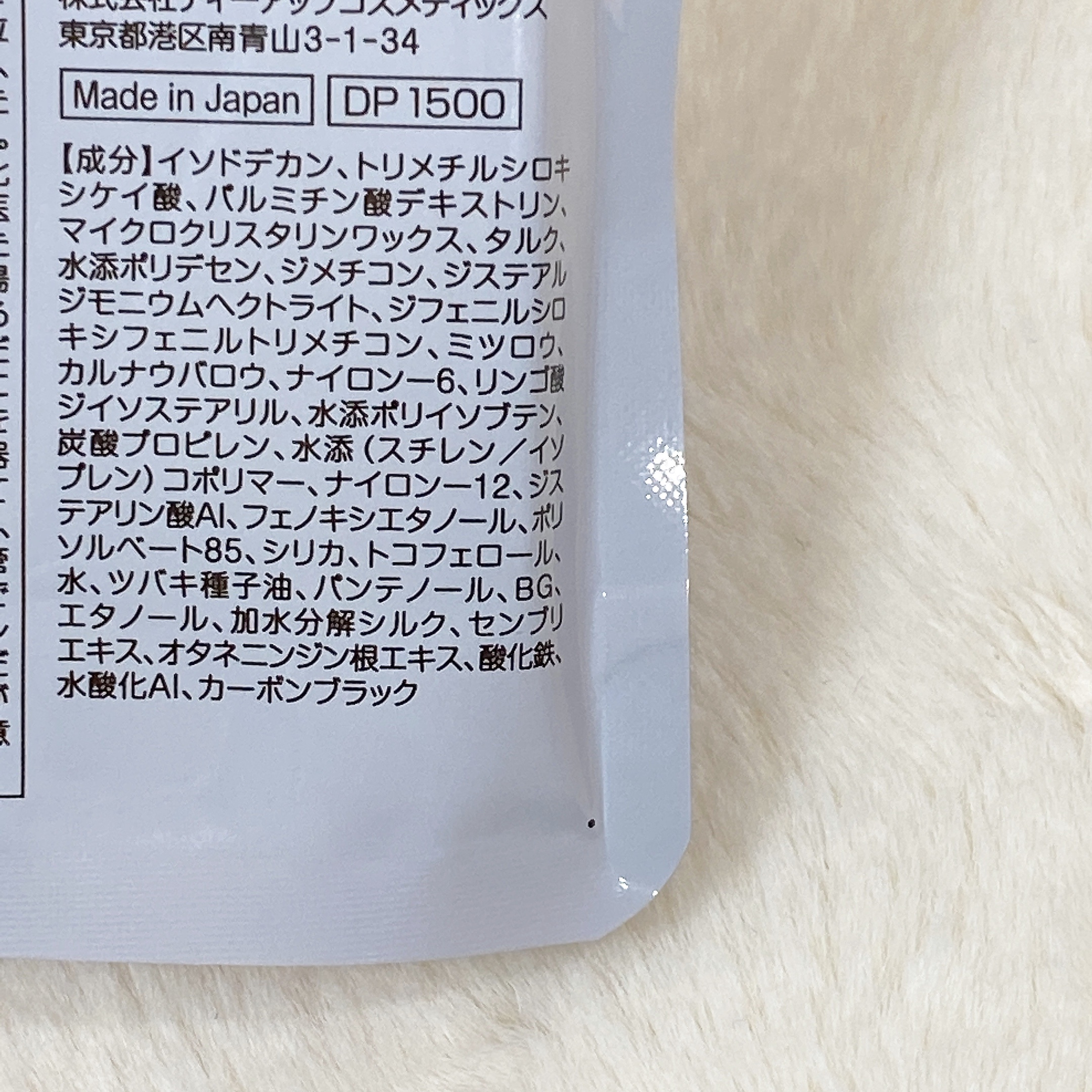 - <ブラック> イソドデカン、トリメチルシロキシケイ酸、パルミチン酸デキストリン、マイクロクリスタリンワックス、タルク、水添ポリデセン、ジメチコン、ジステアルジモニウムヘクトライト、ジフェニルシロキシフェニルトリメチコン、ミツロウ、ナイロンー12、カルナウバロウ、ナイロンー6、リンゴ酸ジイソステアリル、炭酸プロピレン、水添(スチレン/イソプレン)コポリマー、ジステアリン酸Al、フェノキシエタノール、ポリソルベート85、シリカ、トコフェロール、水、ツバキ種子油、パンテノール、BG、エタノール、加水分解シルク、センブリエキス、オタネニンジン根エキス、酸化鉄、カーボンブラック