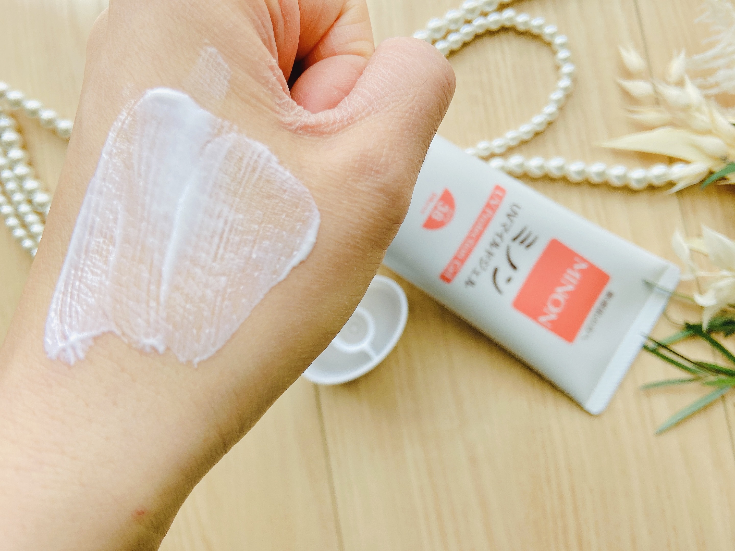 - <70g> 水、酸化チタン、BG、キサンタンガム、フェノキシエタノール、スクワラン、水酸化Al、トリエチルヘキサノイン、ポリメチルシルセスキオキサン、トリエトキシカプリリルシラン、リンゴ酸ジイソステアリル、コレステロール、ミリスチン酸ポリグリセリル-10、グリチルレチン酸ステアリル、含水シリカ、トリ(カプリル酸/カプリン酸)グリセリル、ラウリン酸ポリグリセリル-10、ラウロイルグルタミン酸ジ(コレステリル/ベヘニル/オクチルドデシル)、(アクリル酸Na/アクリロイルジメチルタウリンNa)コポリマー、トリオレイン酸ポリグリセリル-10