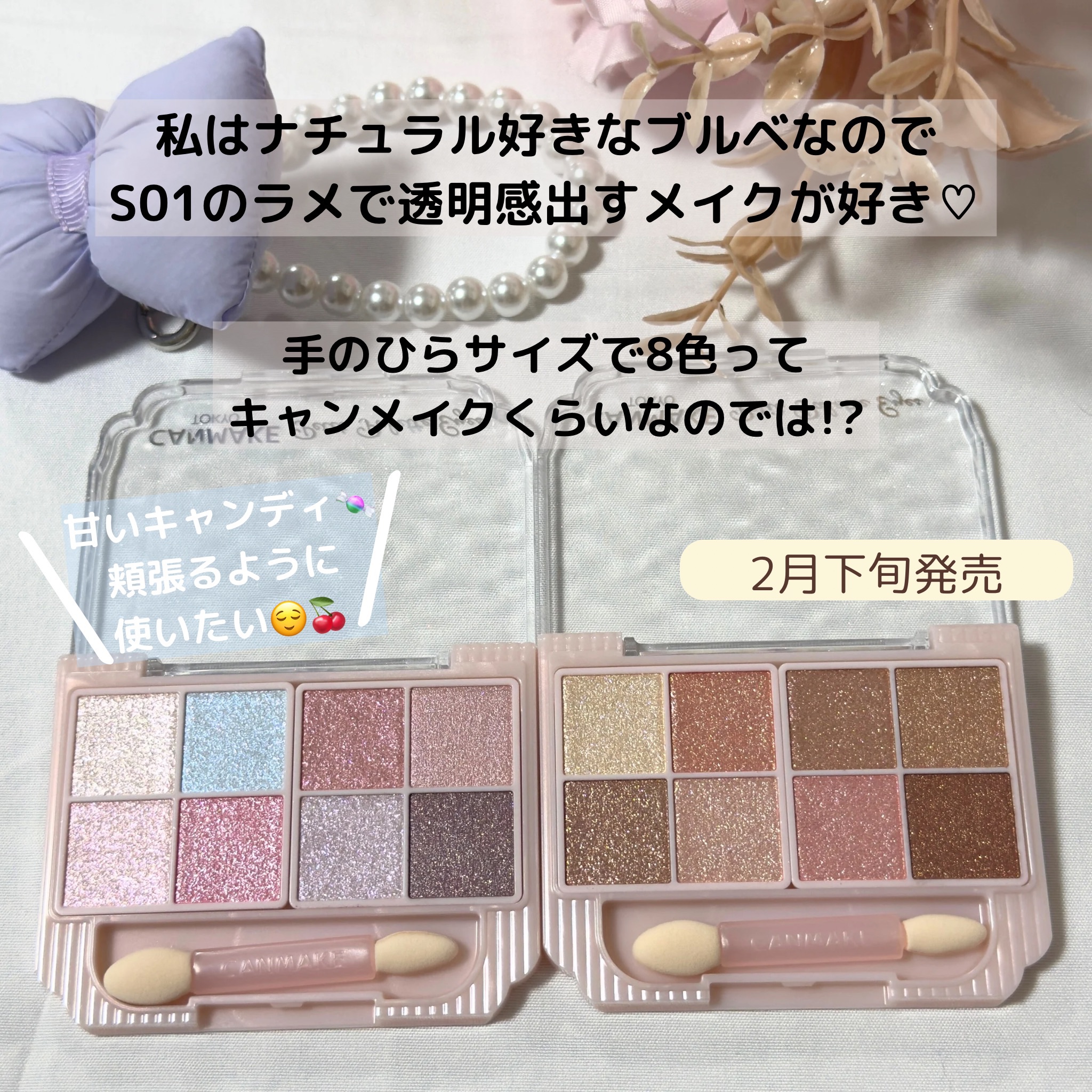 キャンメイクのプティパレットアイズからスパークリングタイプが新登場💎✨💫 このアイシャドウ全部キラキラスパークリングなんだけど、パレットの右側2色は透け感のあるベースが発色するキラキラパウダーで、色付きベースラメって感じだからアイホールに使ってみて♡ S01のオーロラキャンディは全てのカラーが透明感爆発💥💎⁺ ˖ ࣪ ✦笑 S02マカロンキャンディは透明感ありの温かみもある感じ✦こちらのほうがよく発色する‼︎