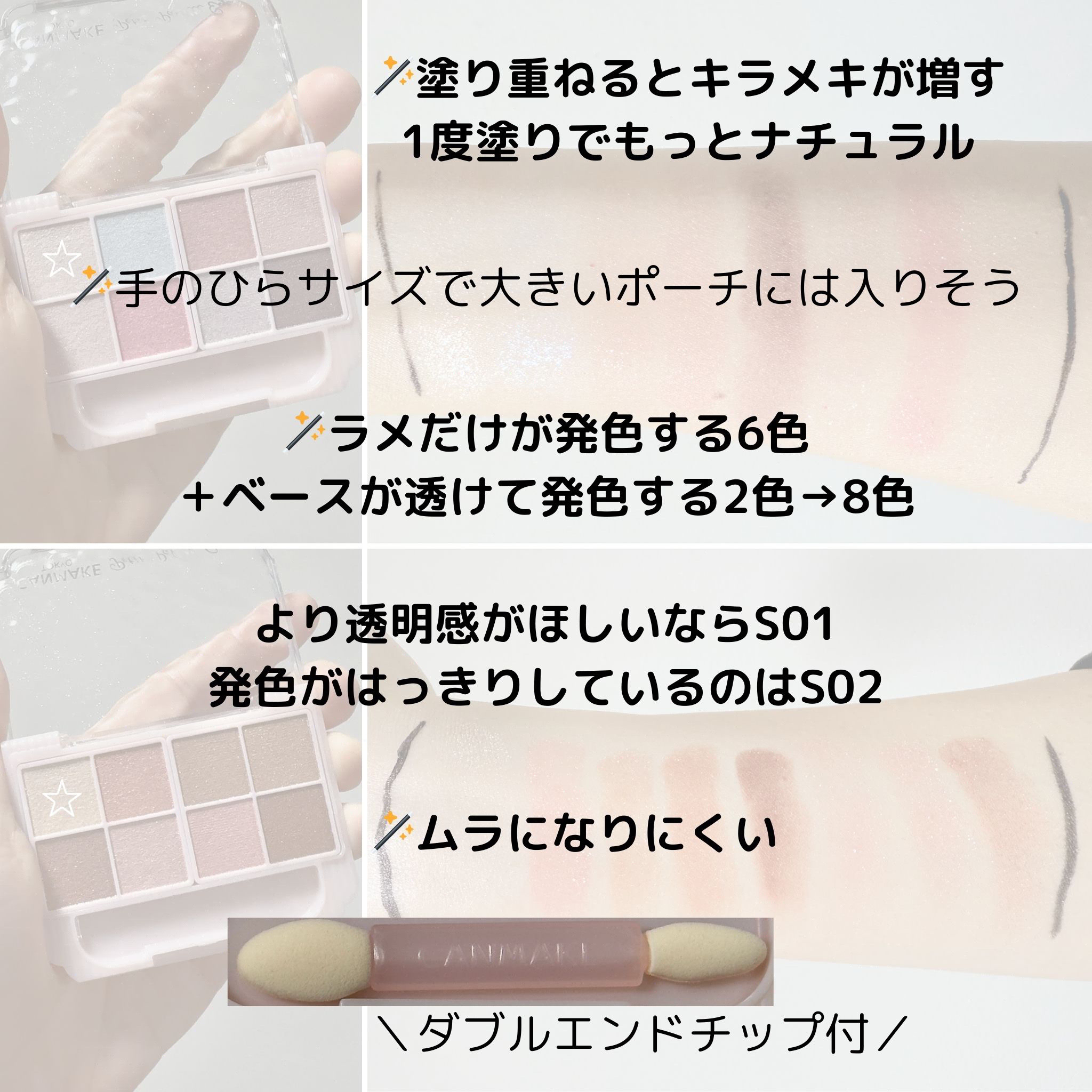 - いつでも一緒💗多色なのに持ち歩ける! 8色入りアイシャドウパレットのラメバージョン✨ 持ち運びやすいサイズ感なのに、贅沢に8色入り&便利なダブルエンドチップ付。 これ1つでアイシャドウが完成するように、 スパークリングタイプは「ラメだけがのるパウダー」を6色、 「ベースが透けて発色するパウダー」を2色セットしています! 使い道に困るような大きすぎるラメではなく、 使いやすさを重視し普段のメイクにも取り入れやすいサイズの ラメを採用しました♪ 他のアイシャドウに合わせて使うのもオススメです✨