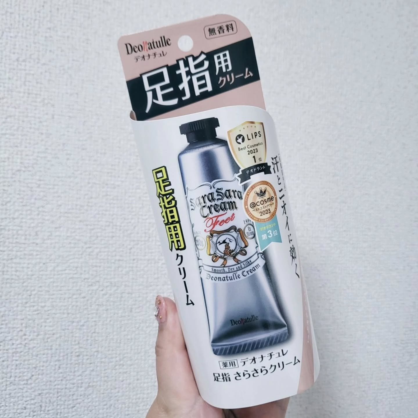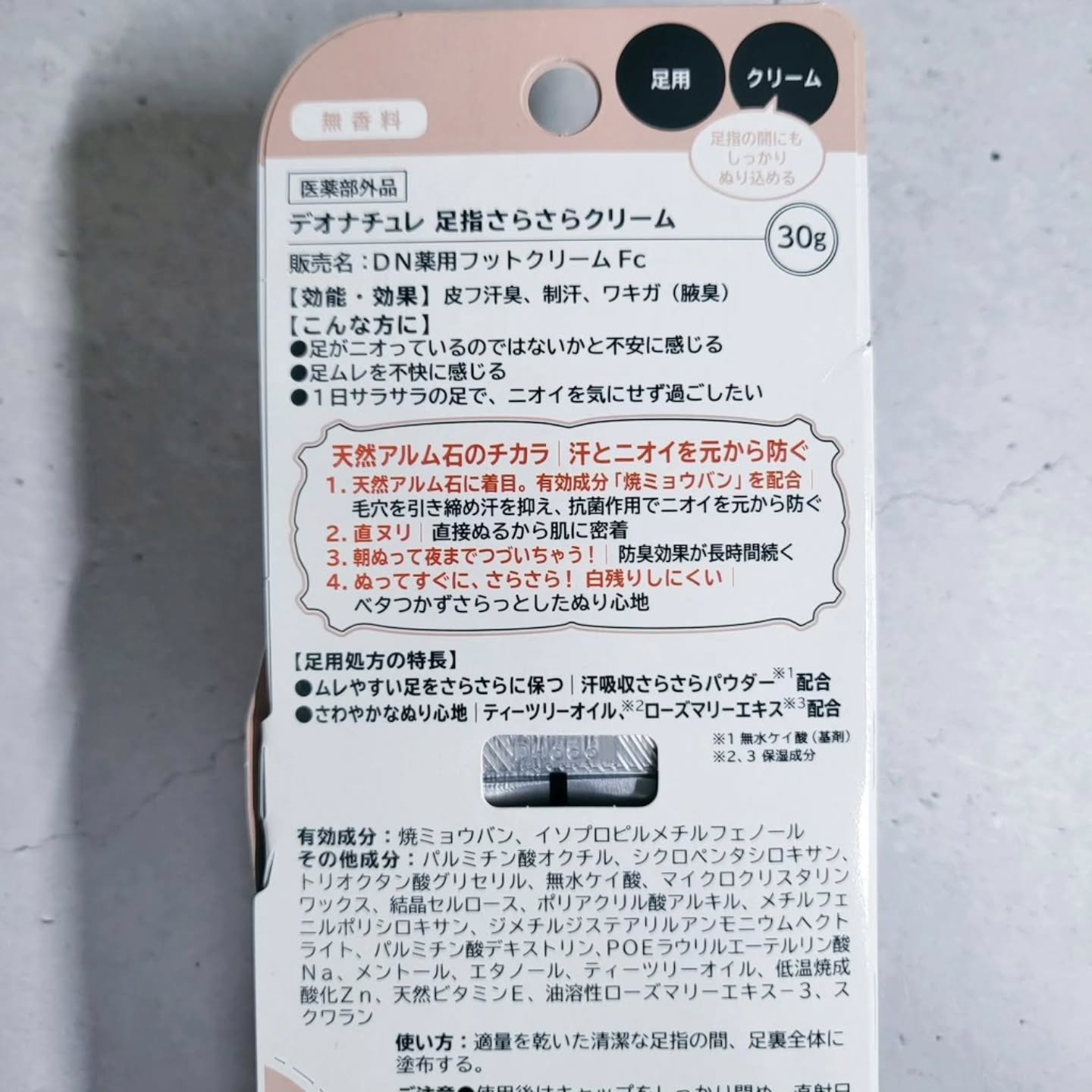 - \11年間ず~っと売上No.1*直ヌリ制汗デオドラントブランド/ 『防臭力のデオナチュレ』シリーズから、足特有のムレ・ニオイを防ぐ足用処方「薬用デオナチュレ足指さらさらクリーム」 ◆◆靴、脱ぐの⁈とドキッとすること、ありませんか?◆◆ 足は1日コップ約1杯分の汗をかき、ムレて、ニオイやすい だから、デオナチュレの足用でケア! ◆◆ユーザーから選ばれる理由◆◆ 1.天然アルム石に着目。有効成分「焼ミョウバン」を配合し、汗・ニオイを元から防ぐ! 足汗吸収さらさらパウダー**やティーツリーハーブ・ローズマリーエキス***を配合 2.ニオイの発生源に“直ヌリ”で、朝ぬって夜まで続いちゃう! 3.クリームなのに、ベタつかず・白残りしにくい ==注意== ●顔・粘膜を避け、除脱毛直後や肌に異常があるときは使用しないでください。●肌に異常が生じていないかよく注意してご使用ください。また、お肌に合わないとき、使用中に赤み、はれ、かゆみ、刺激、色抜け(白班等)や黒ずみ等の異常があらわれたときは、使用を中止し、皮フ科専門医などにご相談ください。●使用後はキャップをしっかり閉め、直射日光や高温多湿を避けて保管してください。●乳幼児の手の届かないところに置いてください。●床、靴、衣類などにつかないようご注意ください。 販売名:DN薬用フットクリームFc *インテージSRI+直ヌリ制汗剤市場(形状:ロールオン・スティック・クリーム・ジェル・パウダー) 2013年5月~2024年4月 デオナチュレシリーズ 累計販売金額 **基剤:無水ケイ酸 ***保湿成分