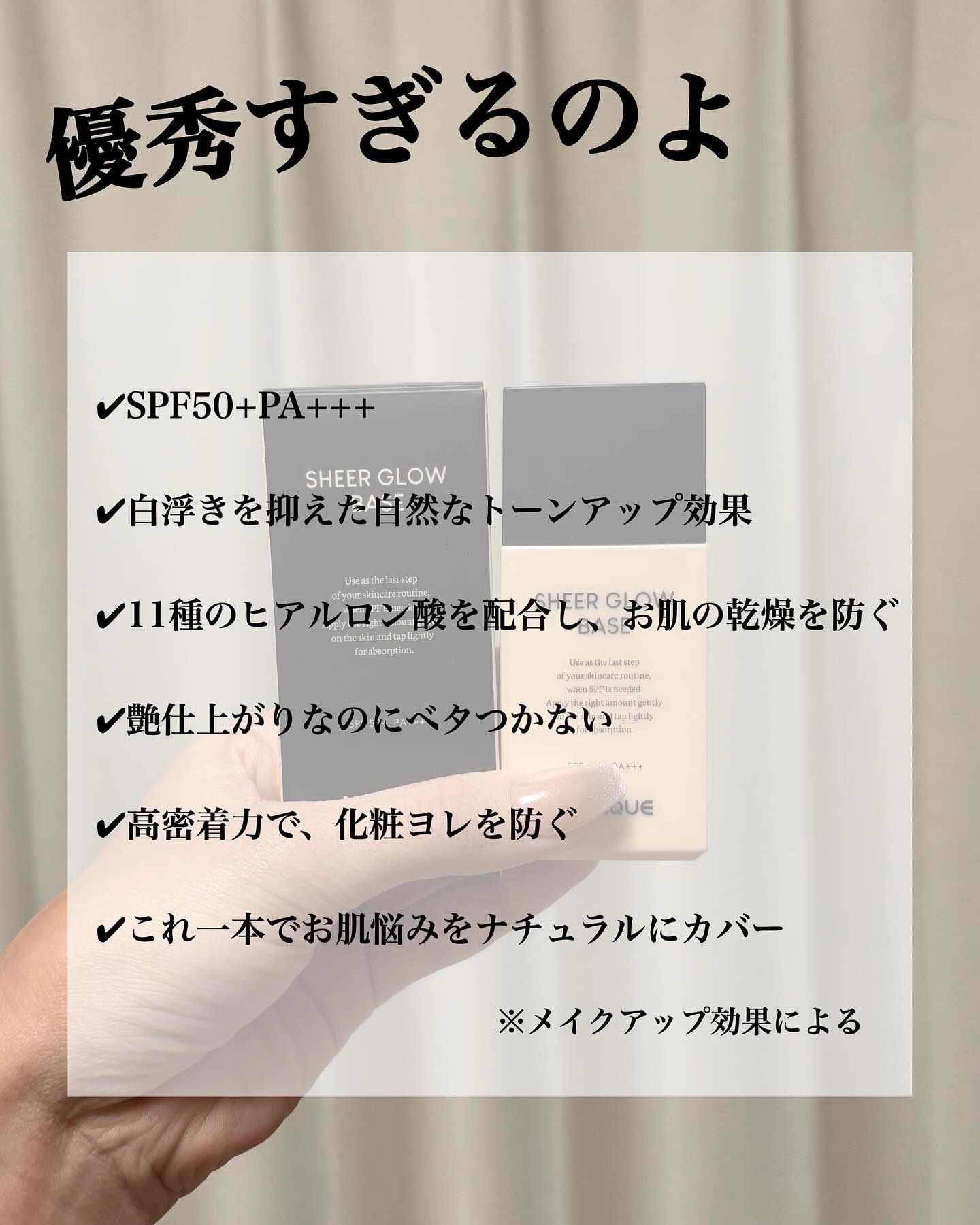 日焼け止めとプライマーだけではなく、白浮きを抑えた自然なトーンアップと11種のヒアルロン酸を配合したツヤ肌まで叶えてくれる4in1✨ ぴたっと密着して1日つけてても乾燥気にならなかったよ☺️👌🏻 ぜひチェックしてみてね🤍