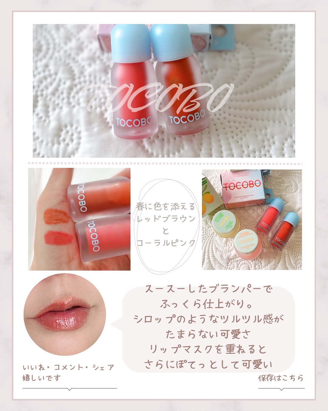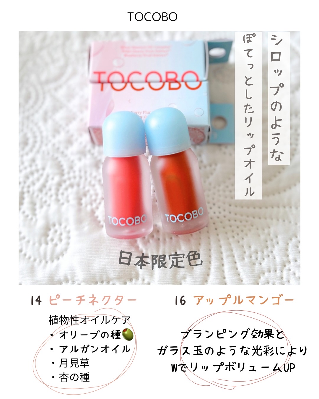かわいすぎるTOCOBO💓 コロンとしたフォルムも可愛いし、カラーもめちゃくちゃすてきだったので共有します🫣 唇の角質、シワをカバーするプランピング機能のリップオイルでピーチネクター、16アップルマンゴー色がもう可愛すぎて可愛すぎて🤤 ほんとに乾燥知らずなちゅるうるリップの完成! 特にオーバーナイトリップマスクを使った後リップオイルでメイクを仕上げたら 角質のないふっくら輝くボリュームツヤリップメイクになるからおすすめだよ🙈