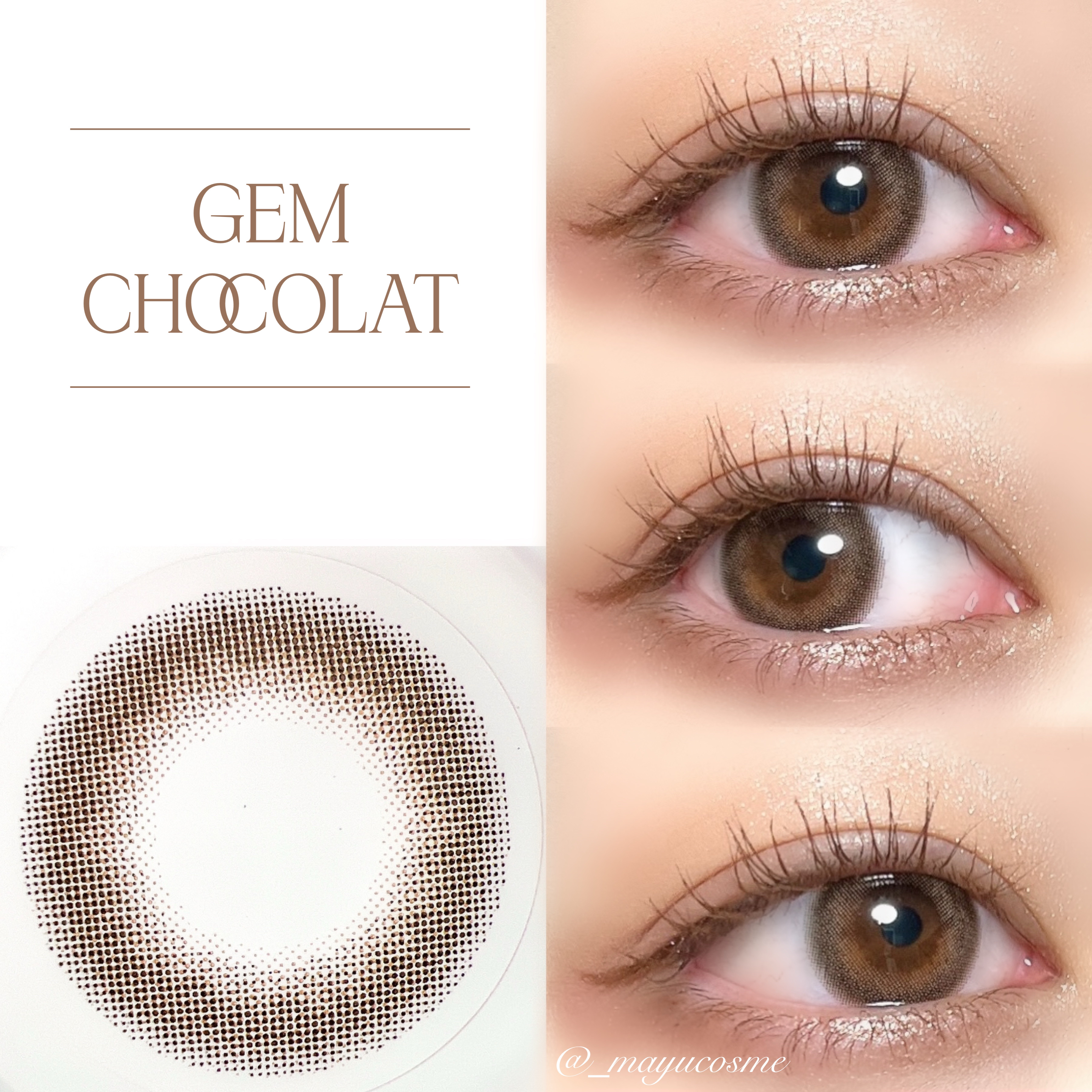 - ※2025年6月以降、商品パッケージ裏面・側面の一部表記を順次変更いたします。尚、これにかかる商品の交換・返品は承っておりません。 ”欲しいのは 大人の透明感”がコンセプト。 黒目のサイズはそこまで変えず、質感だけをナチュラルにキラリと整えてくれるレンズデザインが特徴となっています。 誰でも“裸眼の綺麗な人”に見せてくれる、全2色のラインナップです。 CINNAMON BROWN(シナモンブラウン) DIA 14.2mm / 着色直径12.6mm 透明感のあるシナモンカラー×細フチデザイン 瞳、本来の美しさを引き立てる裸眼風レンズ ALMOND BROWN(アーモンドブラウン)DIA 14.2mm / 着色直径12.6mm 温かみのあるアーモンドカラー×細フチデザイン 瞳、本来の美しさを引き立てる裸眼風レンズ GEM CHOCOLAT(ジェムショコラ)DIA:14.2mm / 着色直径:12.8mm 光を取り込むショコラブラウンカラー×瞳に馴染むふんわりぼかしフチデザイン 瞳、本来の美しさを引き立てる裸眼風レンズ カラーコンタクトレンズの不適正使用による眼障害の危険性等などがあります。 ●コンタクトレンズは高度管理医療機器です。不十分な洗浄・消毒など不適切なケアや、長時間・交換期間を超えた装用により、アレルギー性結膜炎、角膜感染症、角膜潰瘍等の重篤な眼障害が発生する危険性があります ●ご使用前に取扱説明書を確認してください 使用上の留意事項 ●眼科医院等を受診してからお求めください ●眼に異常を感じたら直ちにレンズ使用を中止し、お近くの眼科等で診察を受けてください ●医師の指示にしたがってご使用ください ●コンタクトレンズを装用する場合、自覚症状がなくても、眼科医院等での定期検査を受けてください ●レンズに不具合がある場合は使用しないでください