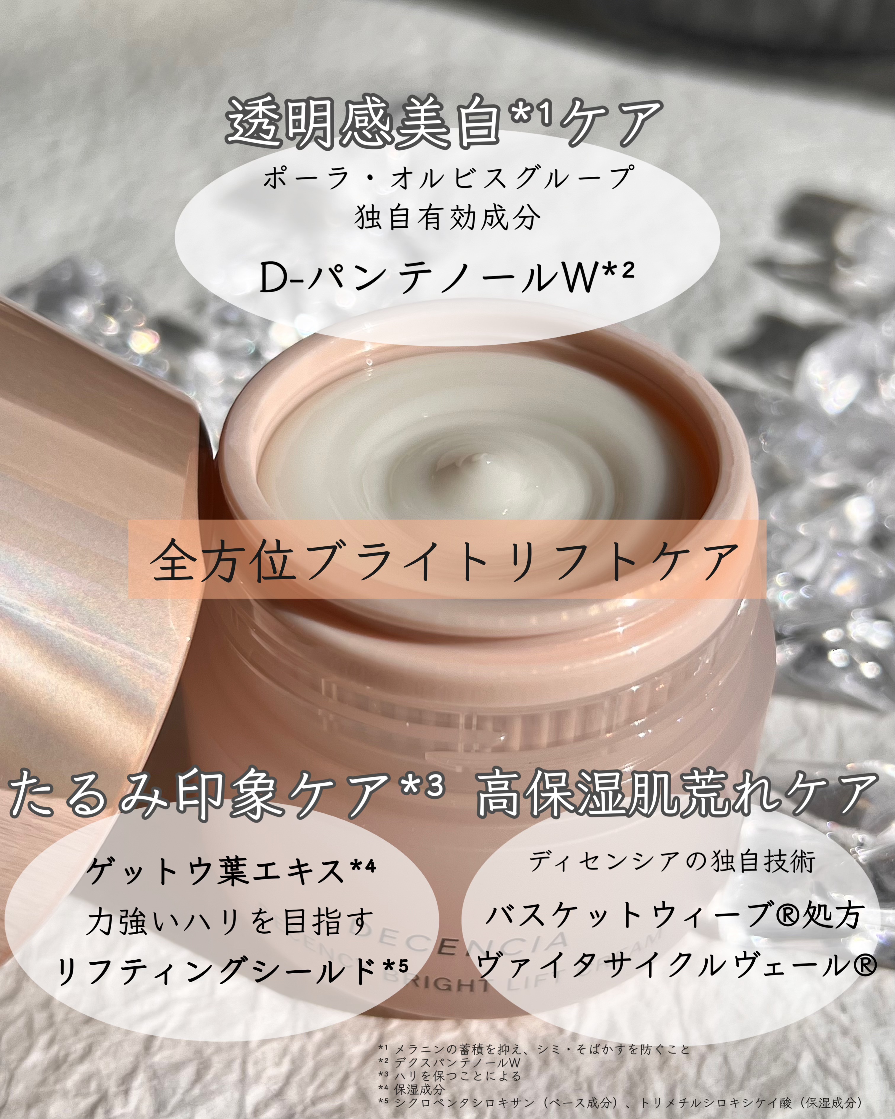美白*1、乾燥、肌荒れ予防まで。全部これ1つ。 ポーラ・オルビスグループだから配合できる医薬部外品の有効成分「D-パンテノールW*2」配合。 ディセンシアの独自技術「バスケットウィーブ®処方」と「ヴァイタサイクルヴェール®」でうるおいを閉じ込めて肌のバリア機能をサポートしてくれるらしい。 濃密こっくりテクスチャーなのに、とっても滑らか〜 お肌のうえでじゅわっととろけるように伸びがよくうるおい感のある仕上がりが好み♥️