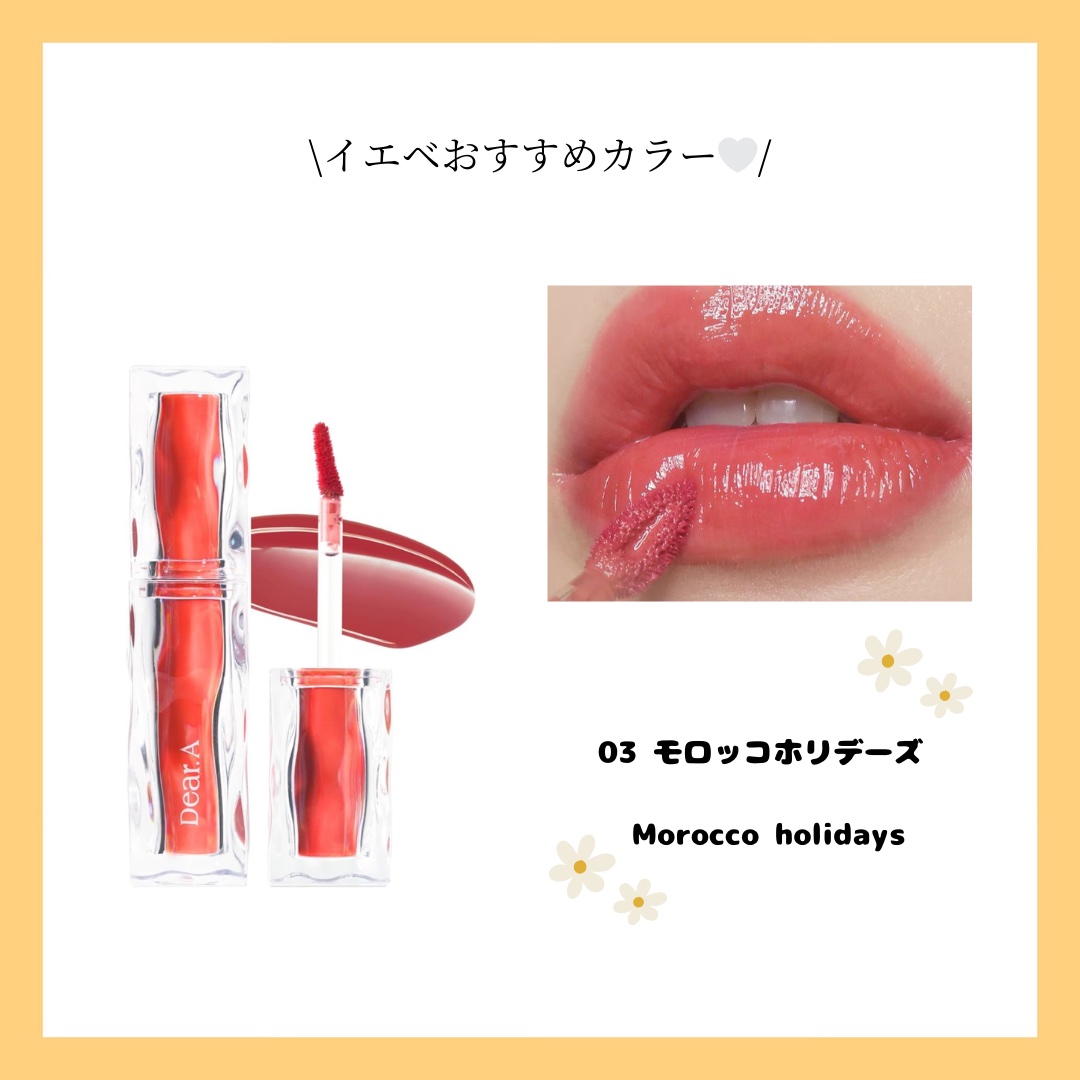 - <01. ピーチアンバー> 水、リンゴ酸ジイソステアリル、ビスジグリセリルポリアシルアジペート-2、ジフェニルシロキシフェニルトリメチコン、ジフェニルジメチコン、水添ポリイソブテン、BG、グリセリン、1,2-ヘキサンジオール、セテアレス-20、セテアリルアルコール、セチルPEG/PPG-10/1ジメチコン、(アクリル酸ヒドロキシエチル/アクリロイルジメチルタウリンNa)コポリマー、ポリソルベート60、フェノキシエタノール、スクワラン、香料、エチルヘキシルグリセリン、EDTA-2Na、イソステアリン酸ソルビタン、水酸化Al、ポリアクリル酸アンモニウム、ホホバ種子油、月見草油、アボカド油、モモ果実エキス、ステアリン酸Na、クエン酸、テトラ(ジ-t-ブチルヒドロキシヒドロケイヒ酸)ペンタエリスリチル、クダモノトケイソウ果実エキス、ヤエヤマアオキ果実エキス、ミルシアリアデュビア果実エキス、アンマロク果実エキス、ヒポファエラムノイデス果実エキス、テルミナリアフェルジナンジアナ果実エキス、酸化チタン、黄5、赤227、赤104(1)、黄4、青1 <02.アプリコットサイダー> 水、リンゴ酸ジイソステアリル、ビスジグリセリルポリアシルアジペート-2、ジフェニルシロキシフェニルトリメチコン、水添ポリイソブテン、ジフェニルジメチコン、BG、グリセリン、1,2-ヘキサンジオール、セテアレス-20、セテアリルアルコール、セチルPEG/PPG-10/1ジメチコン、(アクリル酸ヒドロキシエチル/アクリロイルジメチルタウリンNa)コポリマー、ポリソルベート60、フェノキシエタノール、スクワラン、香料、エチルヘキシルグリセリン、EDTA-2Na、イソステアリン酸ソルビタン、アボカド油、ホホバ種子油、月見草油、モモ果実エキス、ステアリン酸Na、クエン酸、テトラ(ジ-t-ブチルヒドロキシヒドロケイヒ酸)ペンタエリスリチル、アンマロク果実エキス、クダモノトケイソウ果実エキス、ヒポファエラムノイデス果実エキス、テルミナリアフェルジナンジアナ果実エキス、ヤエヤマアオキ果実エキス、ミルシアリアデュビア果実エキス、酸化チタン、黄5、赤227、赤104(1)、青1 <03.モロッコホリデーズ> 水、リンゴ酸ジイソステアリル、ビスジグリセリルポリアシルアジペート-2、ジフェニルシロキシフェニルトリメチコン、ジフェニルジメチコン、水添ポリイソブテン、BG、グリセリン、1,2-ヘキサンジオール、セテアレス-20、セテアリルアルコール、セチルPEG/PPG-10/1ジメチコン、(アクリル酸ヒドロキシエチル/アクリロイルジメチルタウリンNa)コポリマー、ポリソルベート60、フェノキシエタノール、スクワラン、香料、エチルヘキシルグリセリン、EDTA-2Na、イソステアリン酸ソルビタン、水酸化Al、ポリアクリル酸アンモニウム、ホホバ種子油、月見草油、アボカド油、モモ果実エキス、ステアリン酸Na、クエン酸、テトラ(ジ-t-ブチルヒドロキシヒドロケイヒ酸)ペンタエリスリチル、クダモノトケイソウ果実エキス、ヤエヤマアオキ果実エキス、ミルシアリアデュビア果実エキス、アンマロク果実エキス、ヒポファエラムノイデス果実エキス、テルミナリアフェルジナンジアナ果実エキス、酸化チタン、黄5、赤227、赤104(1)、青1、黄4 <04. リトルモーブ> 水、リンゴ酸ジイソステアリル、ビスジグリセリルポリアシルアジペート-2、ジフェニルシロキシフェニルトリメチコン、ジフェニルジメチコン、水添ポリイソブテン、BG、グリセリン、1,2-ヘキサンジオール、セテアレス-20、セテアリルアルコール、セチルPEG/PPG-10/1ジメチコン、(アクリル酸ヒドロキシエチル/アクリロイルジメチルタウリンNa)コポリマー、ポリソルベート60、フェノキシエタノール、スクワラン、香料、エチルヘキシルグリセリン、EDTA-2Na、イソステアリン酸ソルビタン、水酸化Al、ポリアクリル酸アンモニウム、ホホバ種子油、月見草油、アボカド油、モモ果実エキス、ステアリン酸Na、クエン酸、テトラ(ジ-t-ブチルヒドロキシヒドロケイヒ酸)ペンタエリスリチル、クダモノトケイソウ果実エキス、ヤエヤマアオキ果実エキス、ミルシアリアデュビア果実エキス、アンマロク果実エキス、ヒポファエラムノイデス果実エキス、テルミナリアフェルジナンジアナ果実エキス、酸化チタン、赤227、赤104(1)、黄5、黄4、青1 <05.ローズティー> 水、リンゴ酸ジイソステアリル、ビスジグリセリルポリアシルアジペート-2、ジフェニルシロキシフェニルトリメチコン、ジフェニルジメチコン、水添ポリイソブテン、BG、グリセリン、1,2-ヘキサンジオール、セテアレス-20、セテアリルアルコール、セチルPEG/PPG-10/1ジメチコン、(アクリル酸ヒドロキシエチル/アクリロイルジメチルタウリンNa)コポリマー、ポリソルベート60、フェノキシエタノール、スクワラン、香料、エチルヘキシルグリセリン、EDTA-2Na、イソステアリン酸ソルビタン、水酸化Al、ポリアクリル酸アンモニウム、ホホバ種子油、月見草油、アボカド油、モモ果実エキス、ステアリン酸Na、クエン酸、テトラ(ジ-t-ブチルヒドロキシヒドロケイヒ