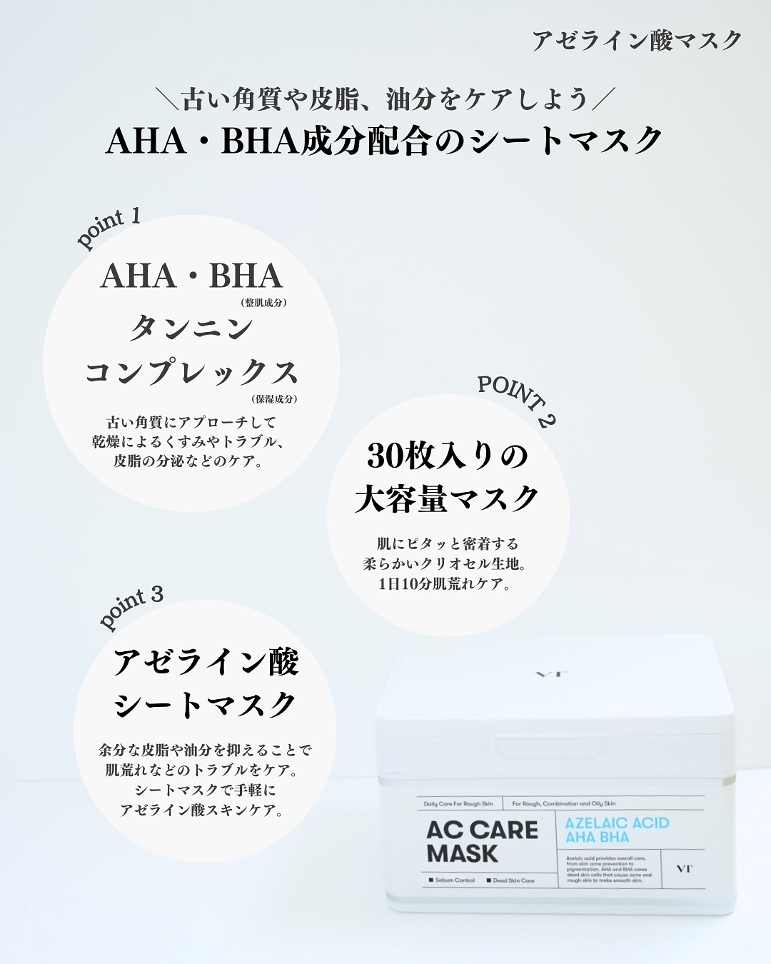 シートマスクの絶対王者VTから25年注目成分「アゼライン酸」配合のシートマスク登場!✨ 同成分のアンプルも発売し、一緒に使用する事でシナジー効果🆙 脂性肌やニキビ肌におすすめ✨ デイリー皮脂・毛穴ケア ニキビ予防からニキビ跡ケアまで🙌 肌に優しく薄い素材で高密着✨ 10分で簡単ニキビケア🫶 30枚入りで毎日使える超コスパアイテム