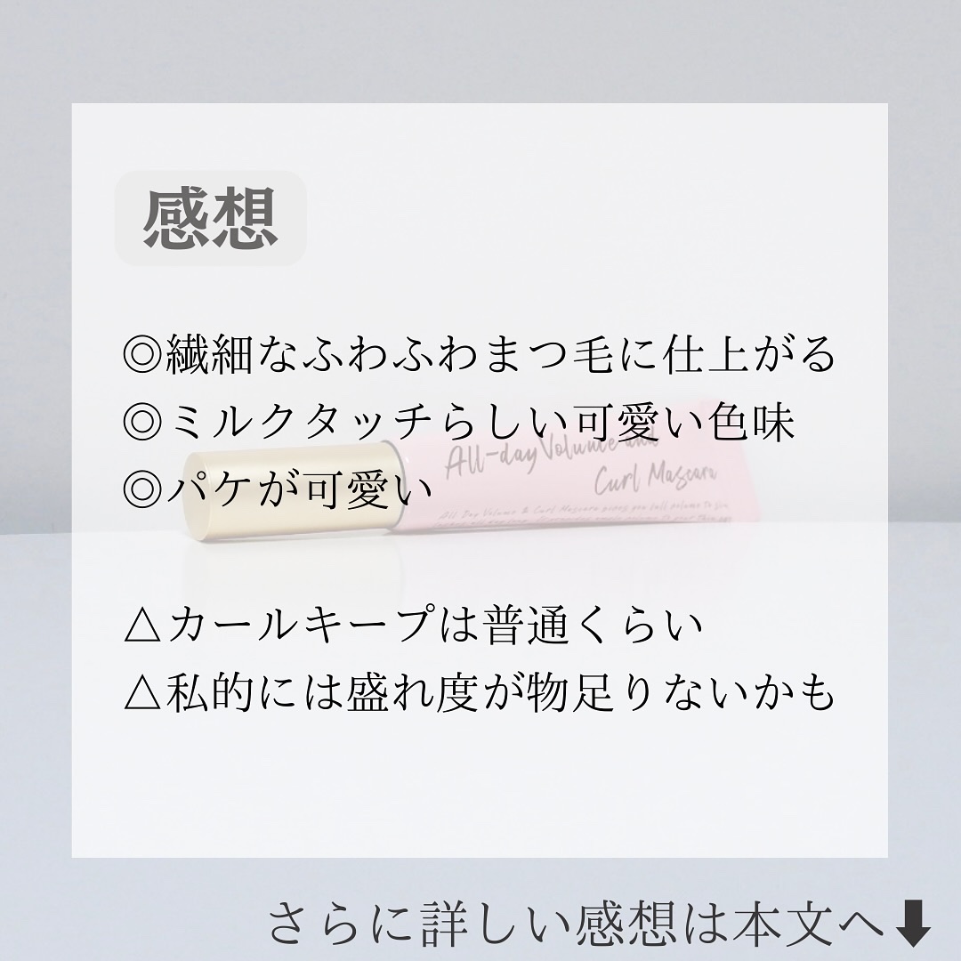 Milk Touch オールデイ ボリュームアンドカールマスカラです😌 細目のブラシで塗りやすく、ボリュームが出てカールアップもするなと思いました✨ 落ちにくいからちょっと落としにくさも感じました。 カールキープされる