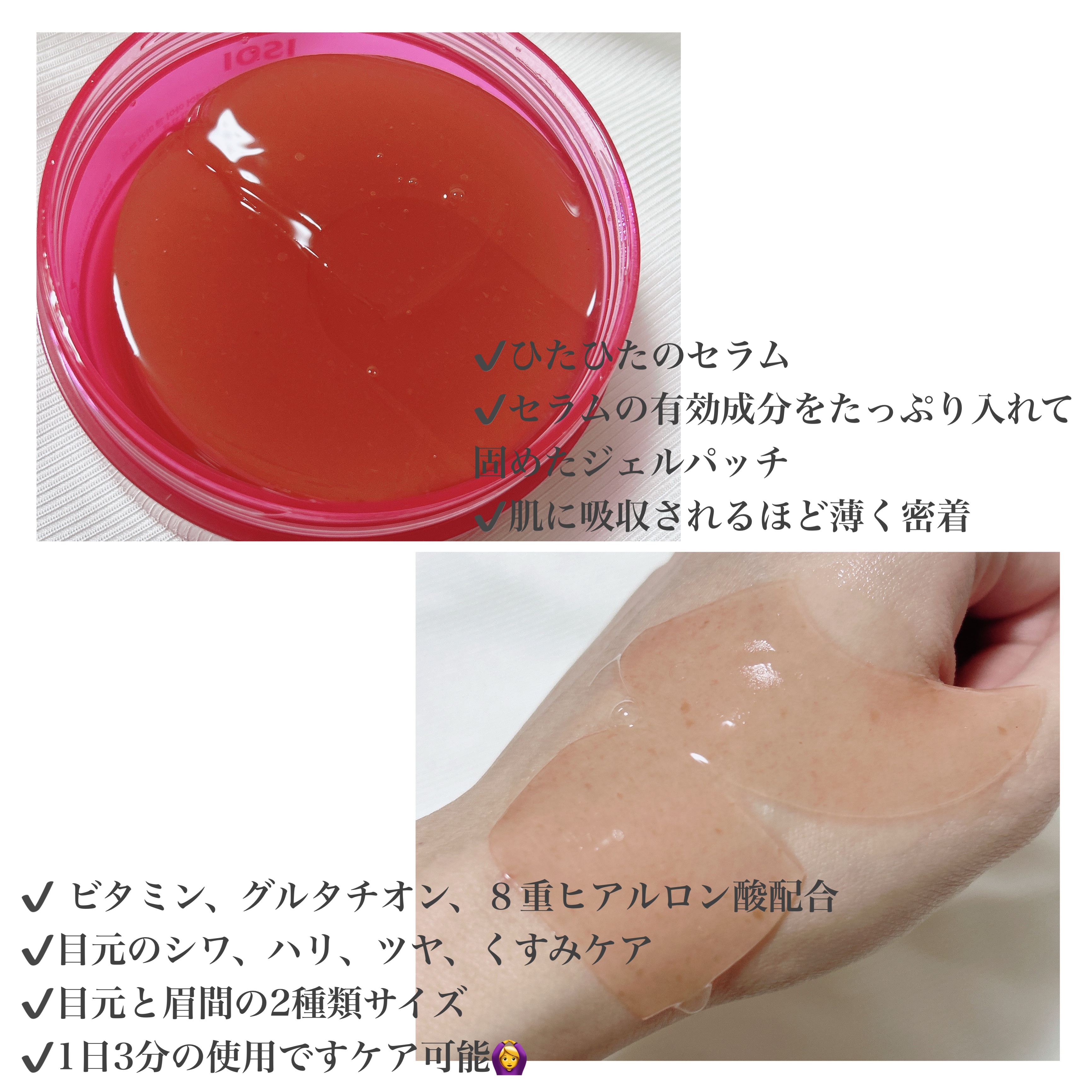 1日3分の簡単ケア❣️ 2種類のサイズが入っており、目元と眉間、同時にケアが可能なのも嬉しい。 オリーブヤングアワード10年連続受賞の、ブレミッシュケアアップセラムの成分がたっぷり入った、プレミアムジェルパッチ。 たっぷりの液でぷるぷるのジェルパッチは、肌にのせて吸収されるほど密着して、とっても気持ちが良くて、お肌がしっとり。