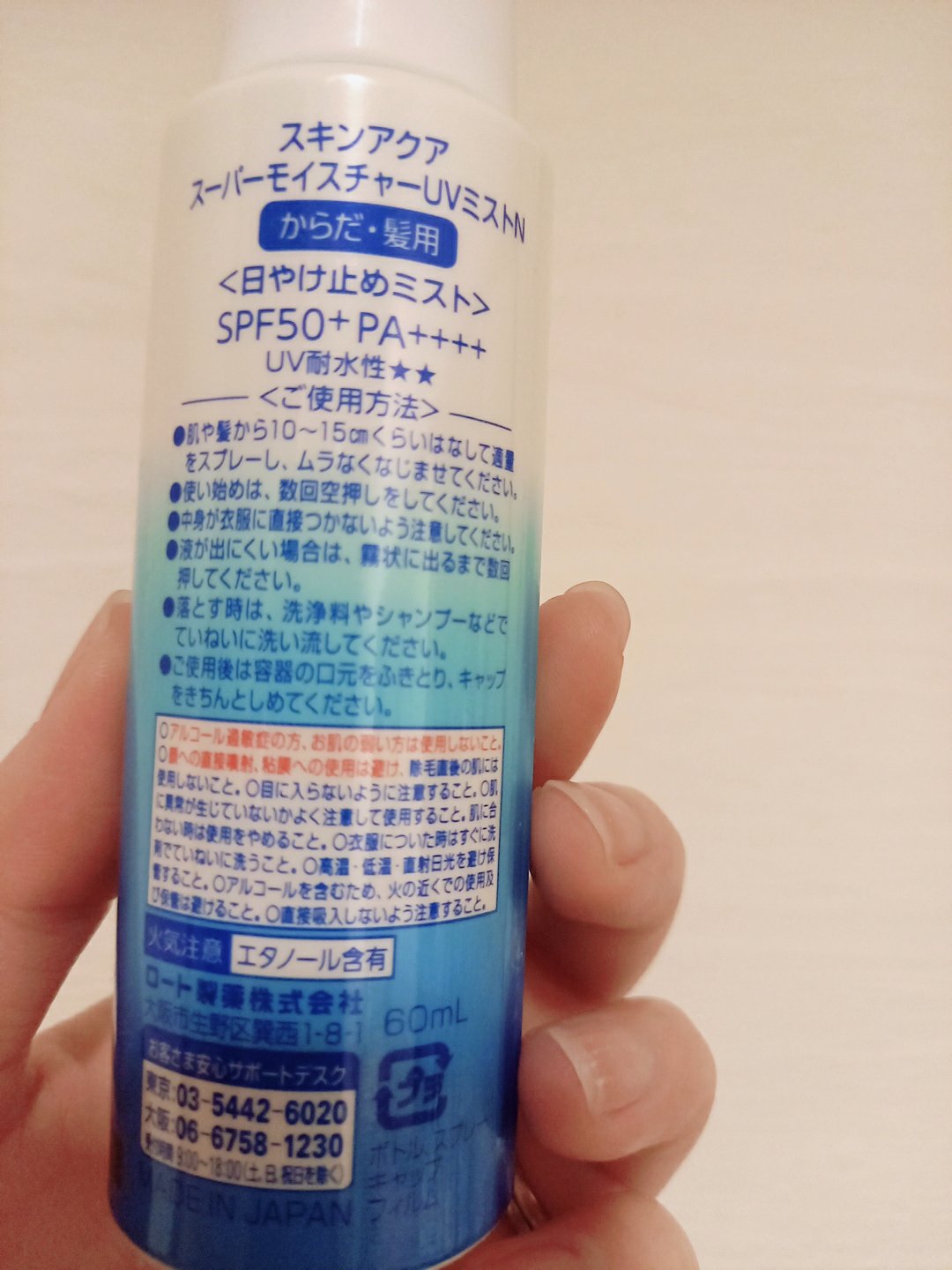スキンアクア スーパーモイスチャーUVミスト日中の紫外線対策からうるおいチャージまで!シュッと簡単👏ミストタイプの日焼け止めです。水感のある軽い付け心地でベタつかない👌からだだけでなく、髪にもシュッと出来るよ!ボトルを逆さにしてもOK!首の後...