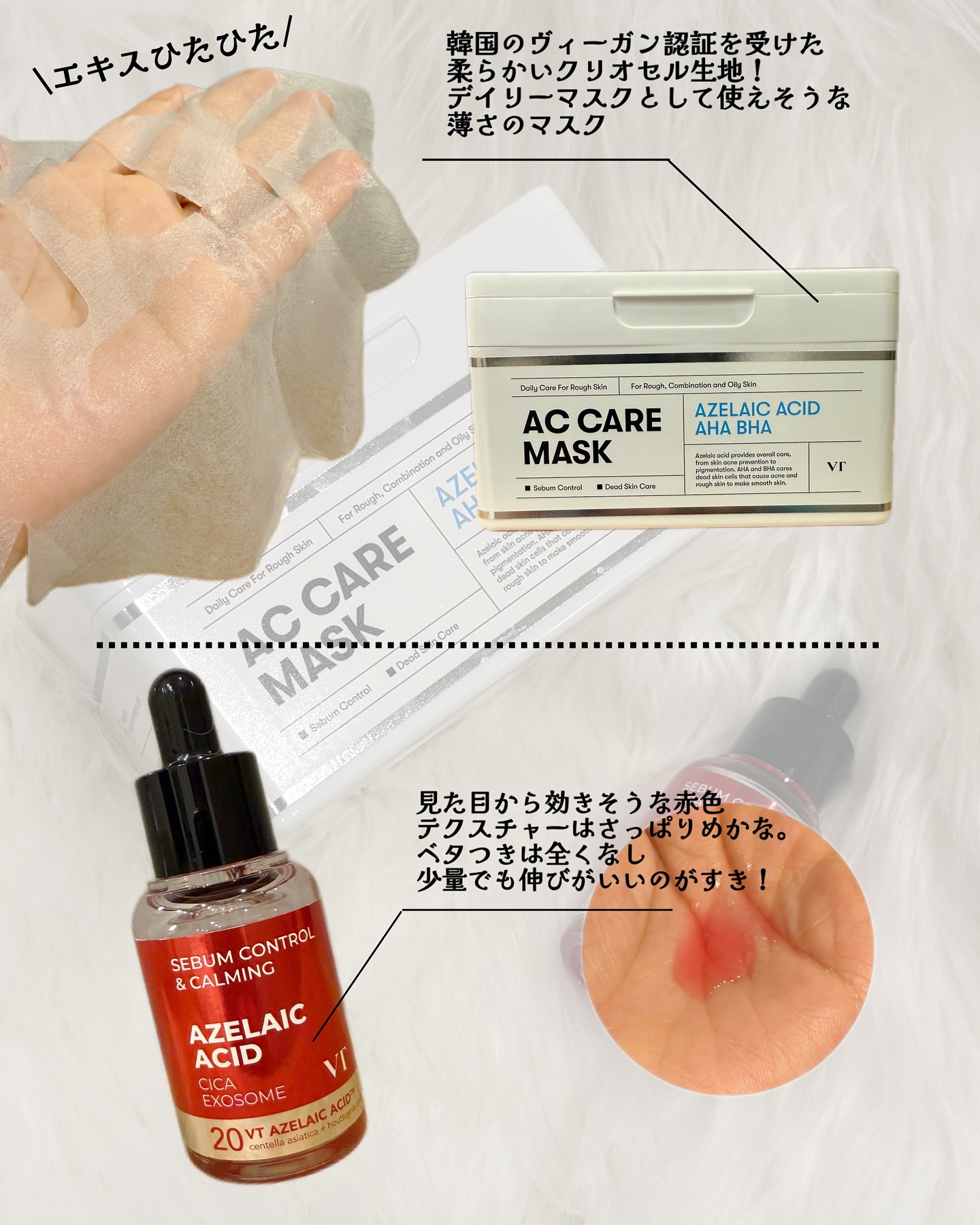 高純度99%アゼライン酸+VTならではの鎮静システムであるCICAエクソソーム配合の高機能アンプル!赤いカラーリングが、もうすでに効果高そう!と期待させてくれます♡⃛ 1日10分で角質ケアを叶える大容量フェイスマスク⋆꙳ 30枚入で気負わず使えるから、使う時の心理的な負担感が本当に軽い♡ アゼライン酸はニキビができている人はもちろん、生理前なんかのニキビできそう!なんてタイミングで使うのもよいそう♡