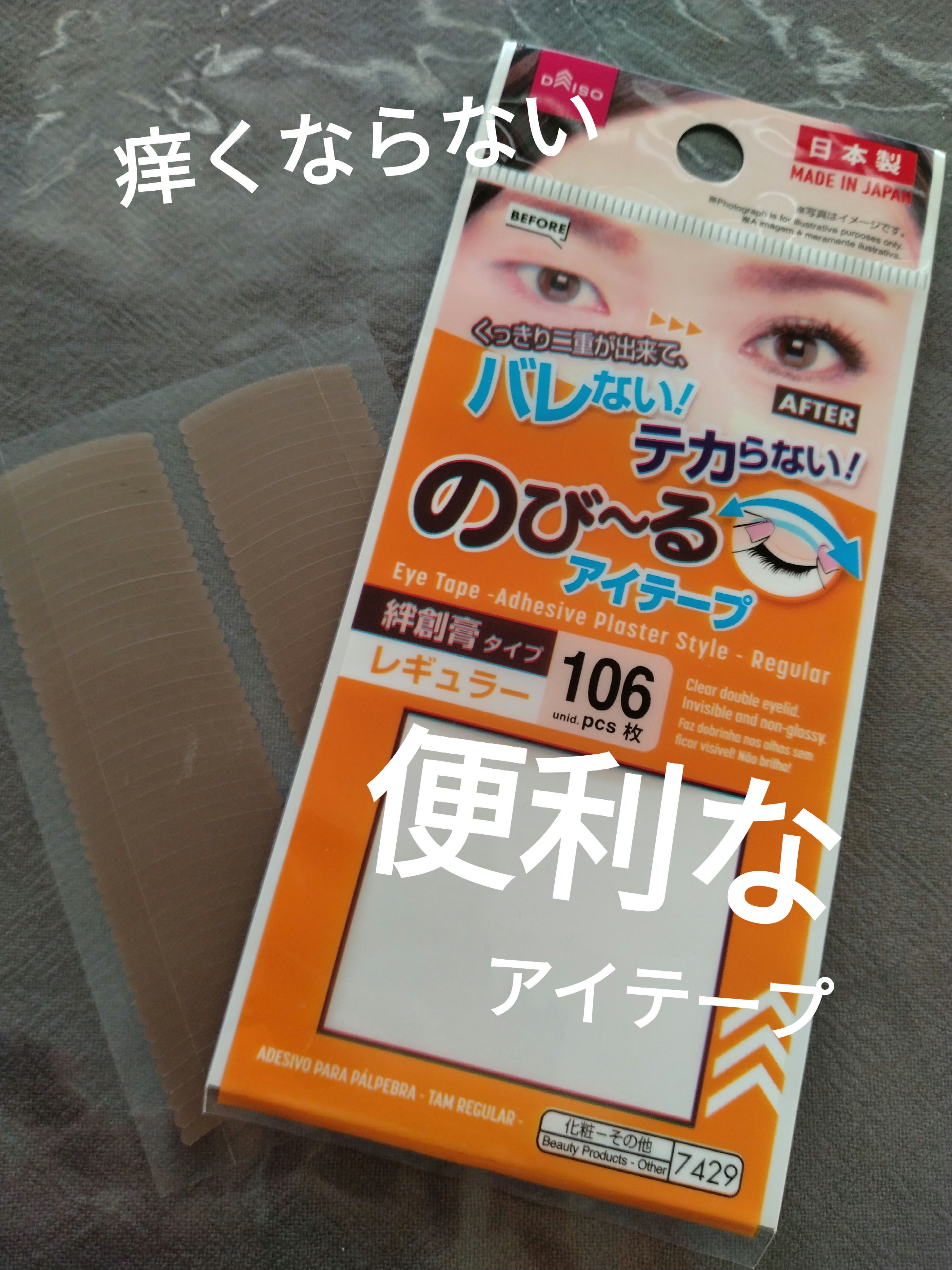 アイプチ苦手勢には厳しいかも…?DAISOアイテープ絆創膏タイプ、レギュラー、70枚レビューDAISOの大人気のび~るアイテープ絆創膏タイプ、レギュラー、70枚を購入しましたこれよく切って使ったりそのまま使ったりしてとても綺麗な二重が作れてい...