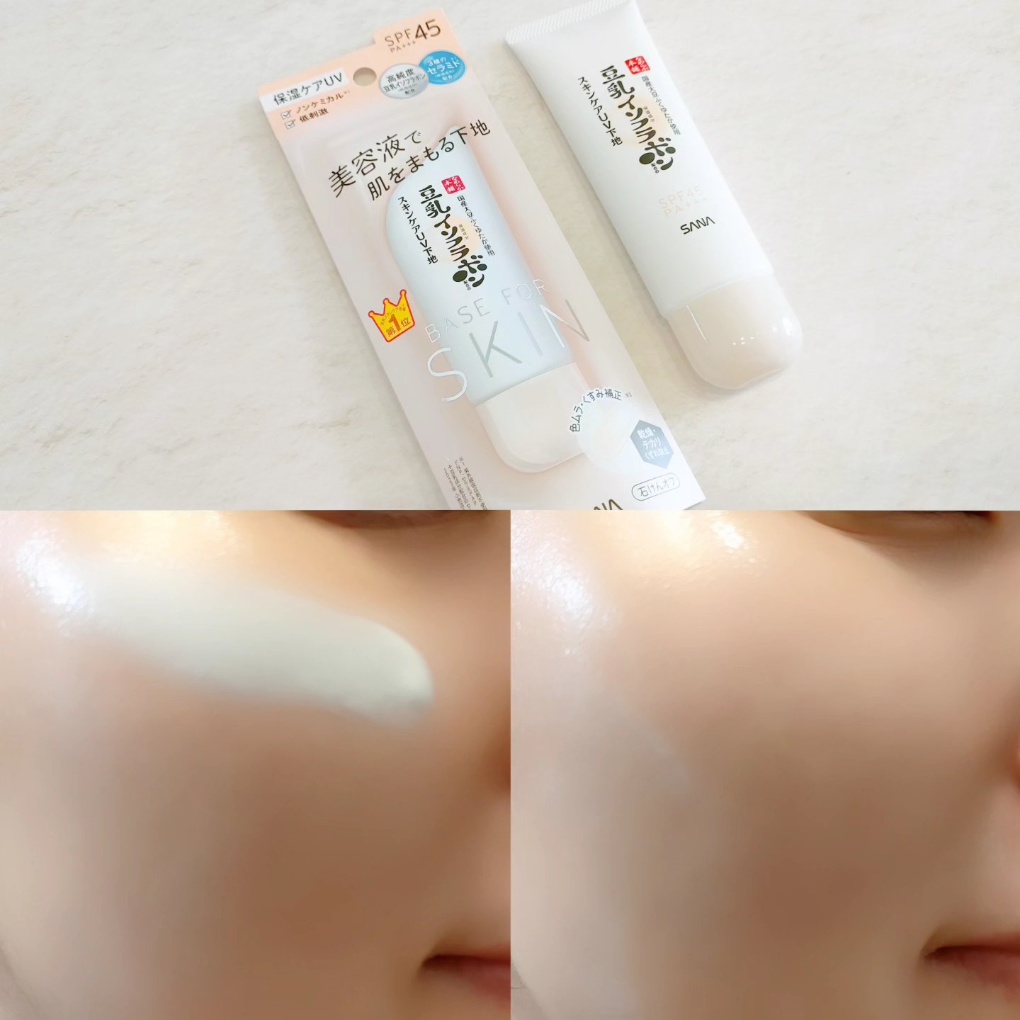 なめらか本舗オリジナルの豆乳発酵液配合(保湿成分)UV下地ですが保湿クリームのような使い心地です。ほんのり肌色で肌色補正*2、ベタ付かずサラッとしていました。 なめらか本舗美白*1ラインオリジナルの豆乳発酵液に加え美白*1有効成分のアルブチンと肌荒れ防止成分を配合。テクスチャはなめらか、肌にスーッと伸ばしやすく白浮きせず肌に馴染んで、トーンアップ*2を感じます。