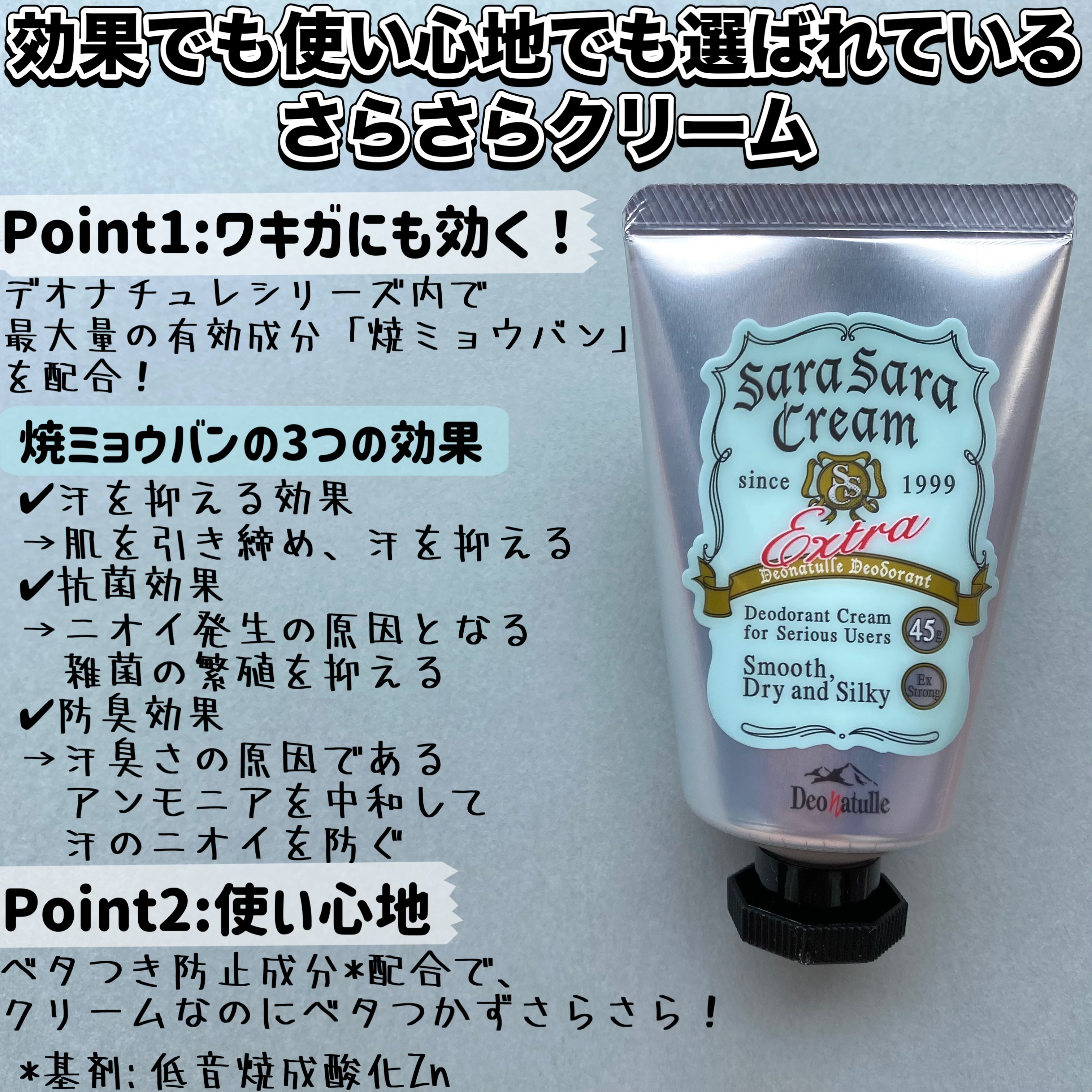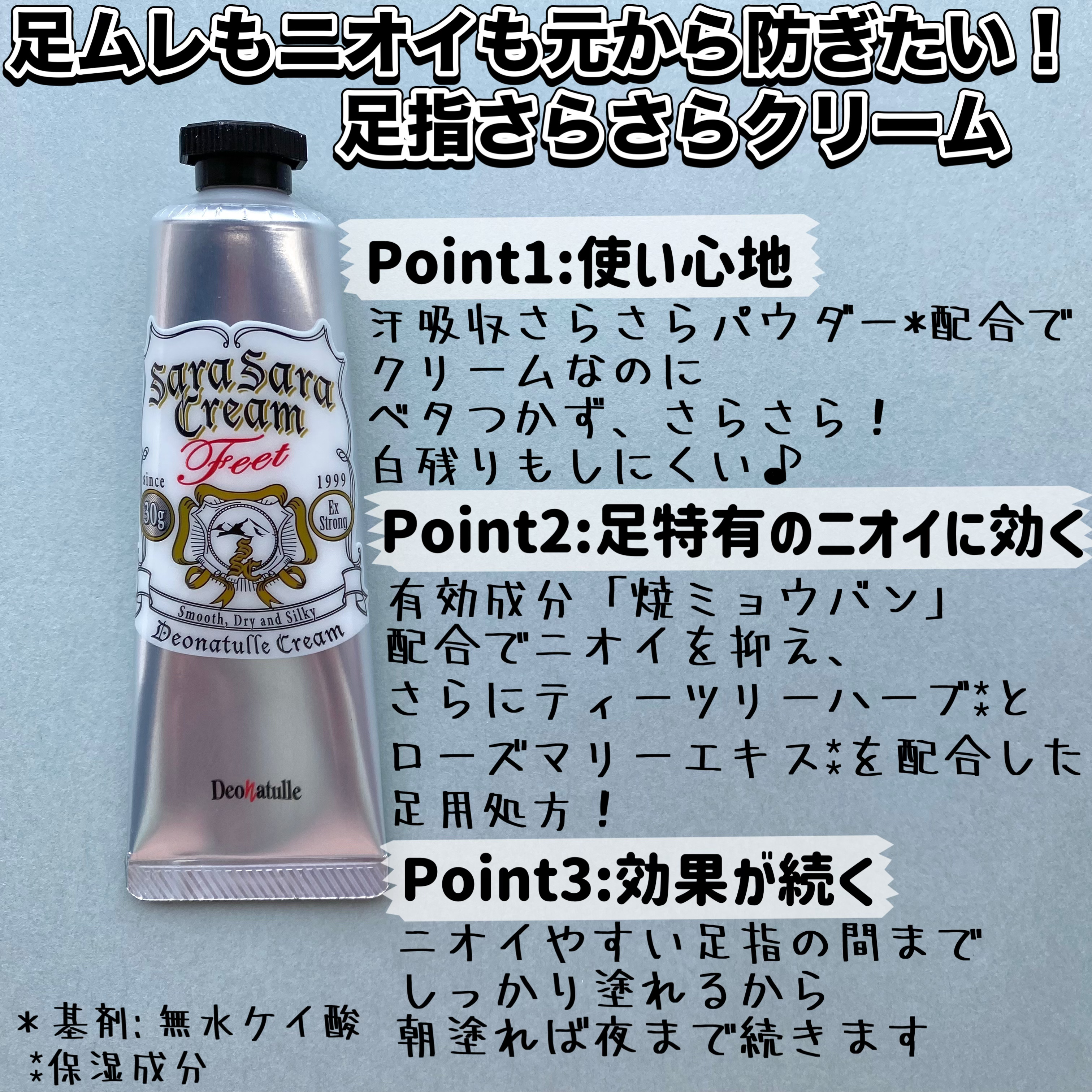 足のにおい対策の定番薬用足指さらさらクリーム。汗ばむ季節はもちろん、ブーツを脱ぐ時にも気になりますよね。つけるとサラサラが長持ちして、一本あると安心です。 薬用さらさらクリームは全身に使えるタイプ。クリームタイプのデオドラントはしっかり汗のにおいをおさえてくれて、コートやニットでムレそうな日に使いたい。 どちらも長く愛される、定番デオドラントです。